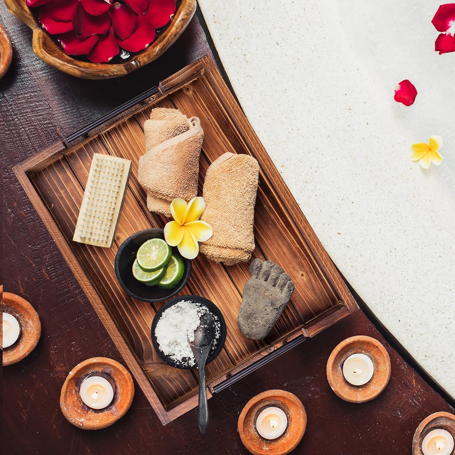 • BEAUTIFUL HANDCRAFTED DESIGN – Carefully crafted from premium quality fir wood material with fine attention to details, our wooden serving tray set or tray for ottoman coffee table has ergonomically fitted metal handles for ease of carrying. Measuring 17”x 13”, this wood serving tray (rectangle) is the ideal size to carry snacks, drinks, and meals around the house without any hassle - WONDERFUL home decor!
