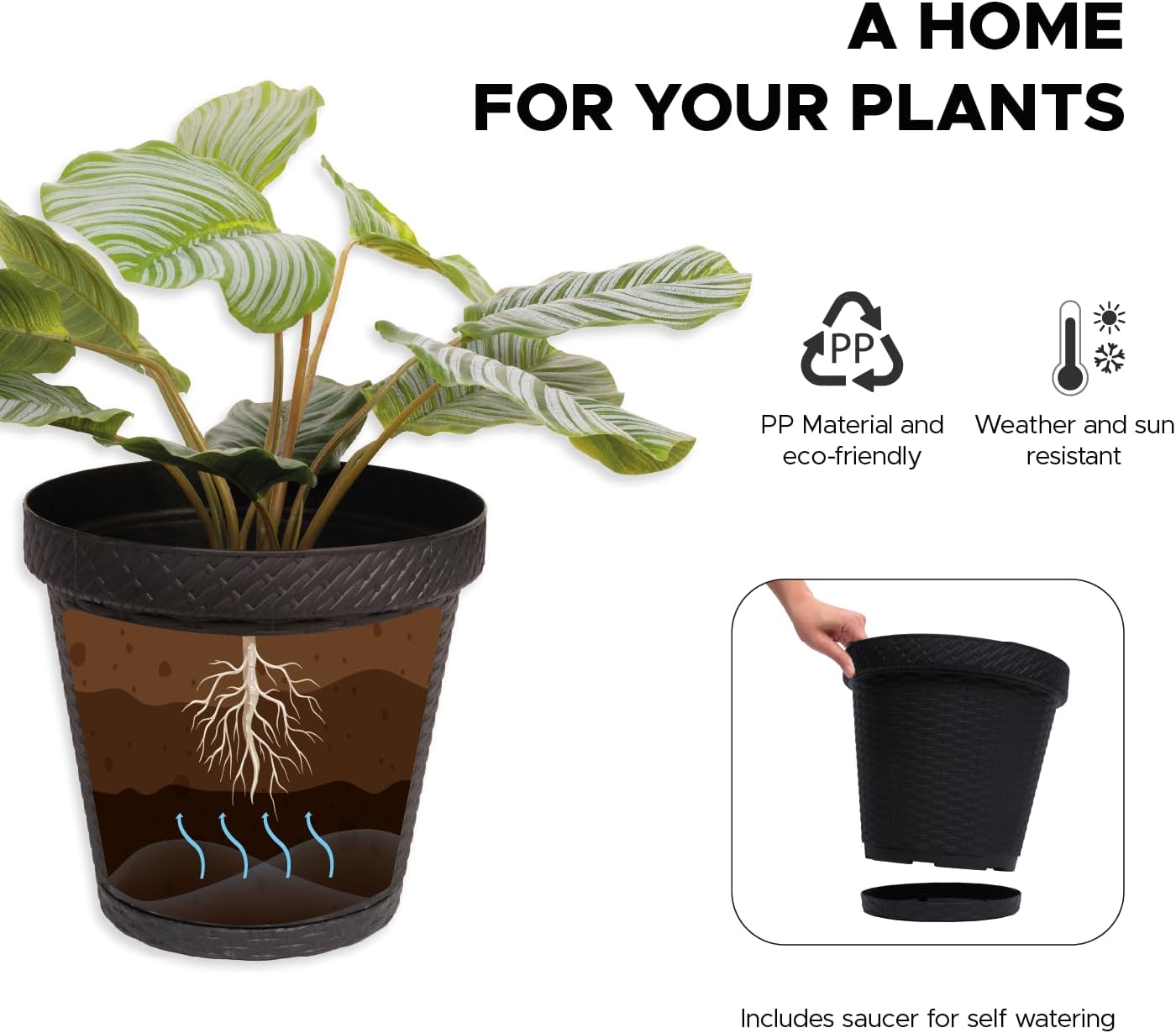Elly Décor Set of 2 12 inch Round Saucer Modern Self Watering Planter Plates, Pots with Rattan-Like Finish, 12x12 Gray