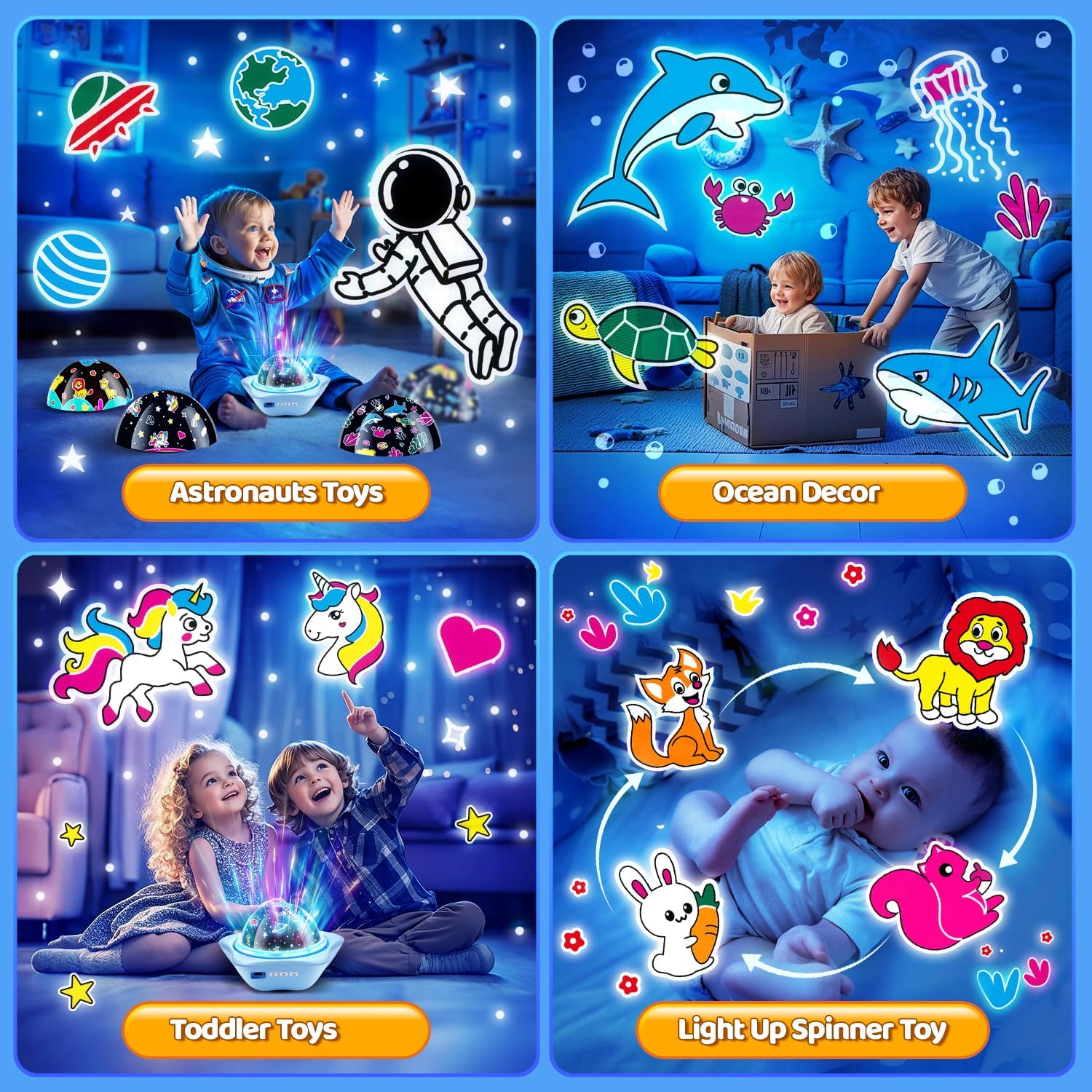 • UNIQUE 2 in1 Star Projector for Kids Dinosaur Toys: Unique & Pretty star projector for kids toys & dinosaur toys for kids 2-9 looks fun & cool,this favourite kids night light projector boasts of 6 most colorful films especially designed for kids! !The star projector for kids toys has 6 colorful films make 90 lighting show,can projection the star moon,ocean,unicorn,dinosaur,lion,Astronauts ceiling & wall,creating a dream-like create a funny pleasant and relaxing play&sleep environment for kids.Which kids can deny a cute dinosaurs /stars/Astronauts projected on kids bedroom&accompany kids into sleep?Just take this dinosaur toys & star projector as kids most unforgettable kids toys&kids gifts!