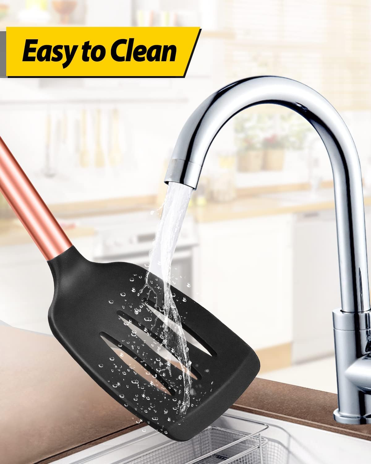 Pack of 2 Silicone Solid Turner, Non Stick Slotted Kitchen Spatulas, High Heat Resistant BPA Free Cooking Utensils, Ideal Cookware for Fish, Eggs, Pancakes(Rose Gold Black)