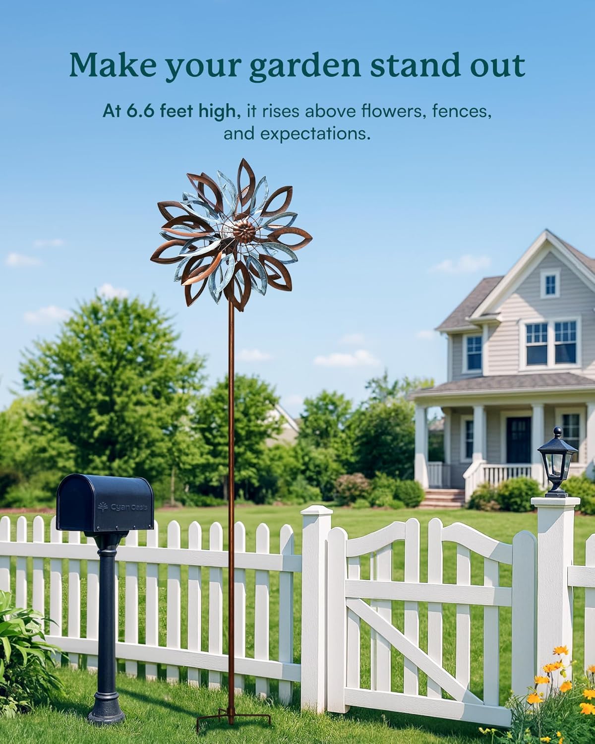 • 【BEAUTIFUL DESIGN】The stunning metal yard spinners features a lovely blend of copper and teal finishes and classical leaves design. Dual rotors spin independently and rotate 360 degrees. The kinetic yard wind spinners has stronger poles (diameter 20mm, 40% thicker than others) and stable metal stake to ensure its firmly planted for windy days and against a snowy landscape.