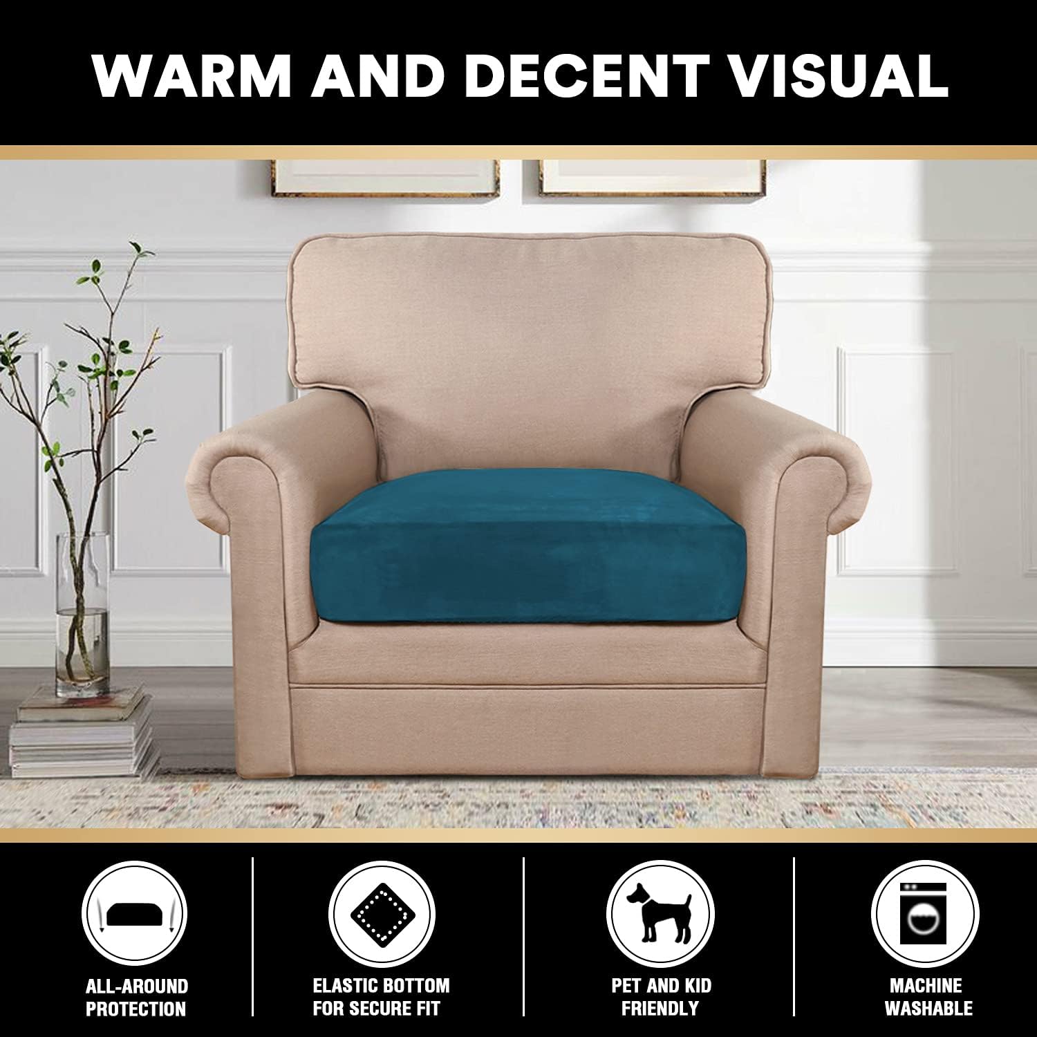 PrinceDeco Couch Cushion Cover Cushion Slipcover for Chair Sofa Cushion Furniture Protector Seat Cushion Sofa Cover for Dog Pet Kid with Elastic Straps Width Up to 29.5", Deep Teal