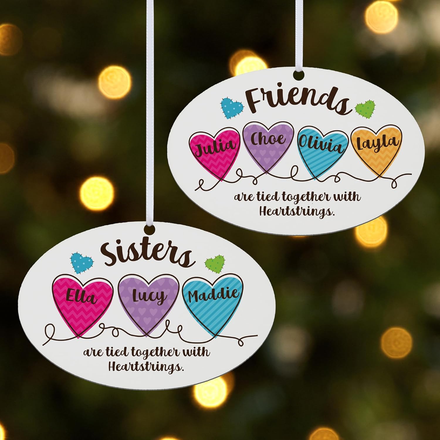 • UNIQUELY PERSONALIZED: Choose Sisters or Friends design. Customize your pastel ornament with any 2–6 names up to 12 characters each—letters or numbers. The sentiment "are tied together with Heartstrings" always appears.