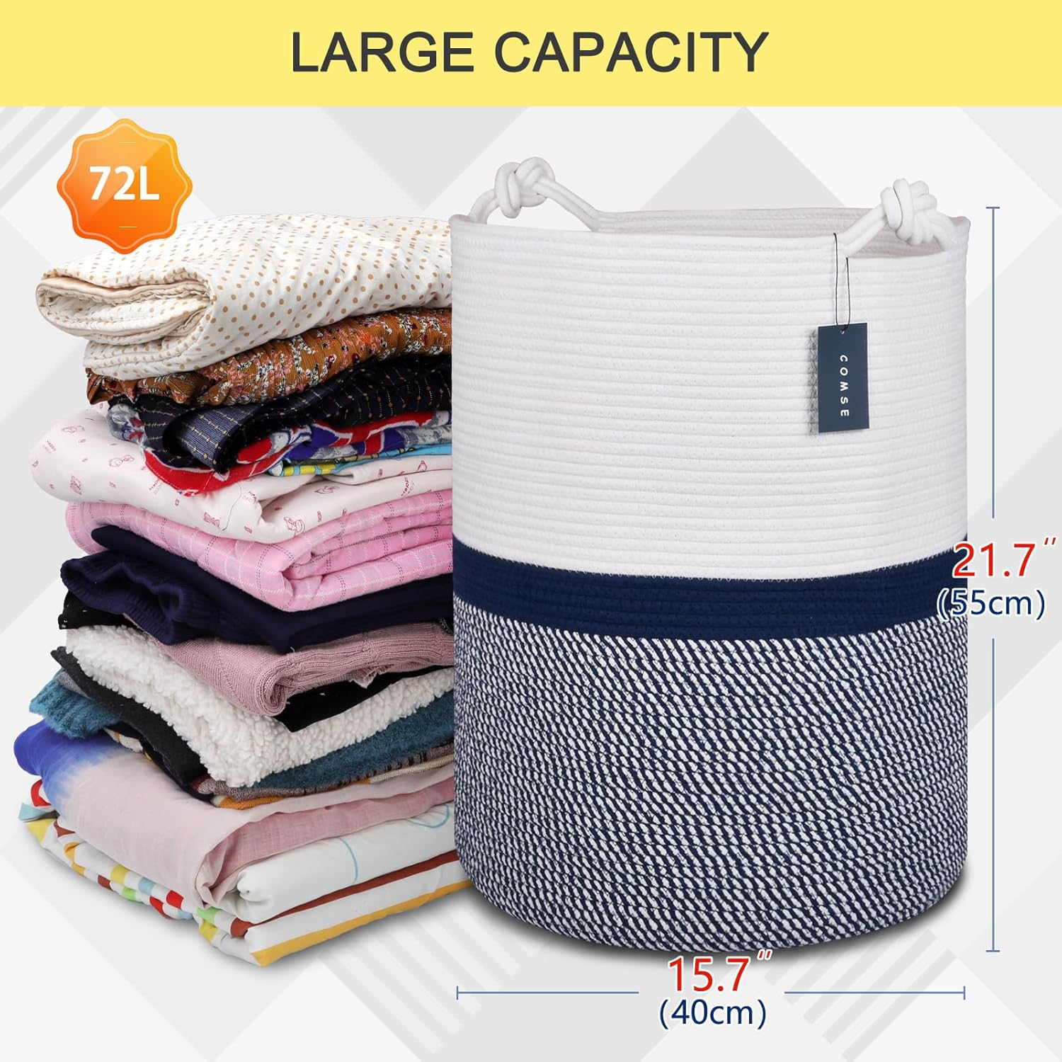 COMSE Extra Large Blanket Basket, Tall Woven Storage Basket, Nursery Hamper, 15.7”x 21.7”, Cotton Rope Laundry Hamper for Toys Clothes Towels, Blend White/Navy Blue