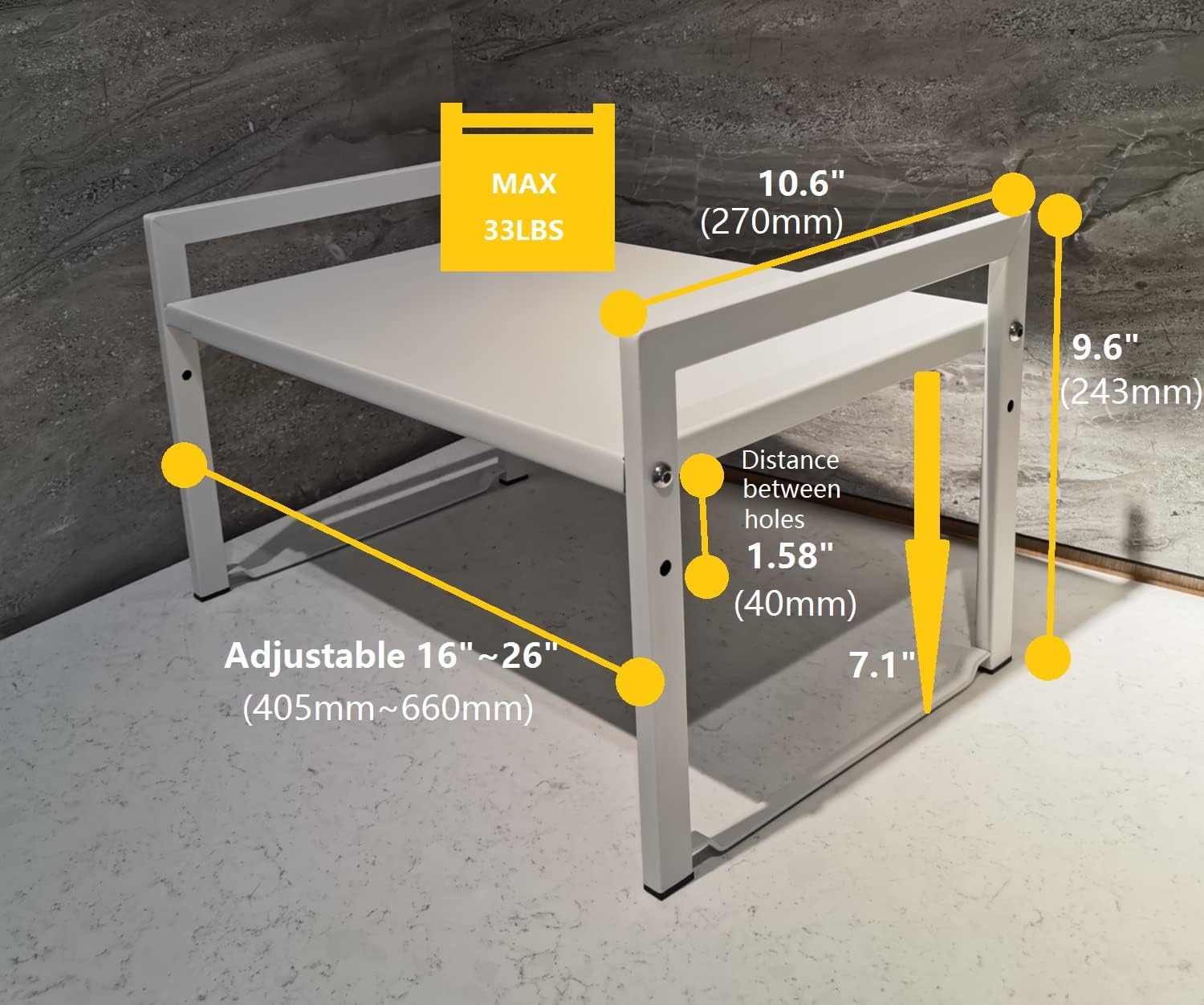 • Versatile Space-Saving Design: This expandable counter shelf adjusts from 16-26 inches (L), 10.6 inches (D), 9.6 inches (H), with a height of 7.1 inches under the shelf, making it perfect for organizing various spaces like kitchens, offices, bedrooms, and more