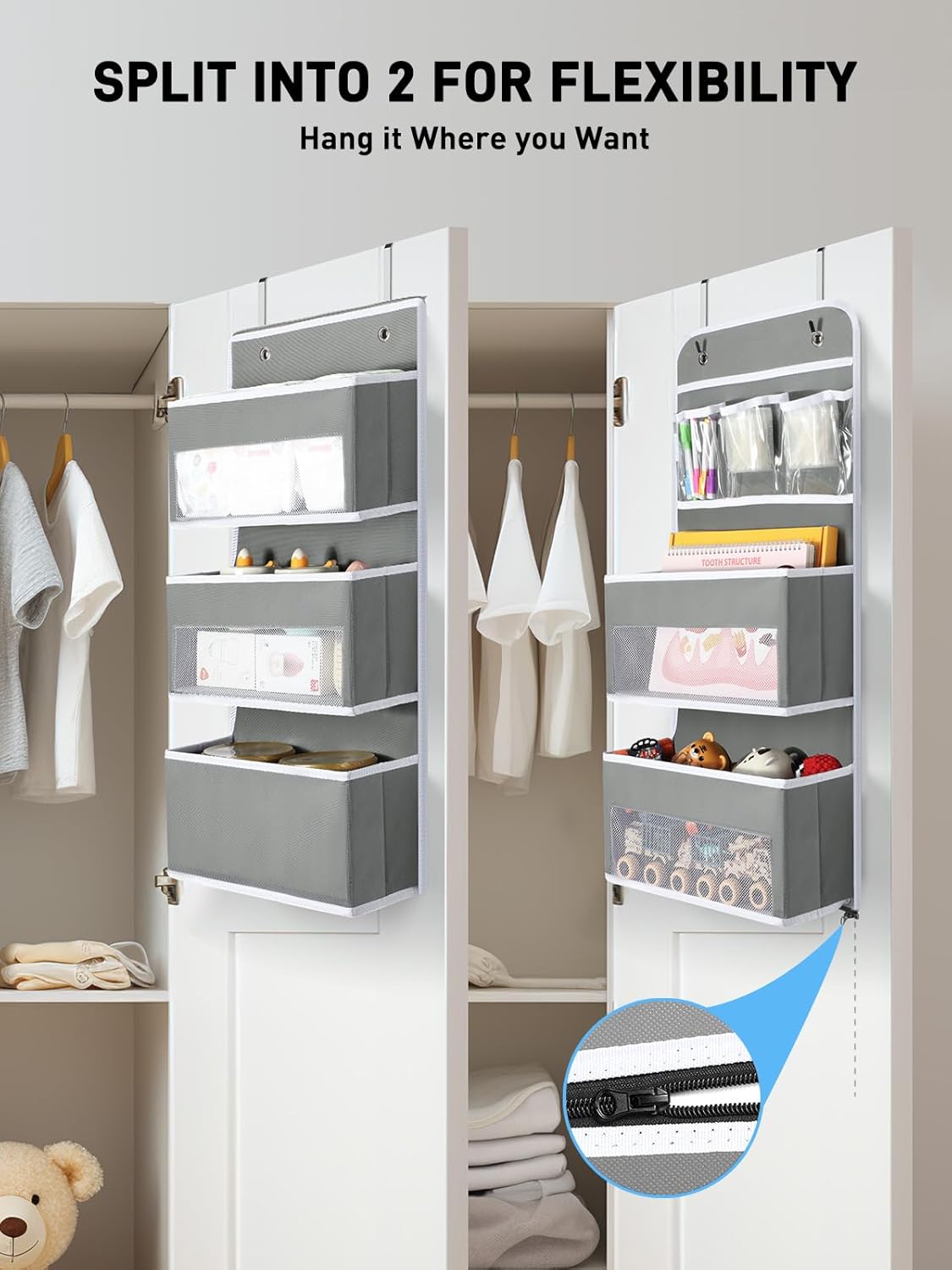 Yecaye 6-Tier Over the Door Storage Organizer, Flexible 1 Split into 2 Swing-proof Hanging Bathroom Storage Organization, Bedroom Organizer and Storage for Newborn Baby Essentials, Grey