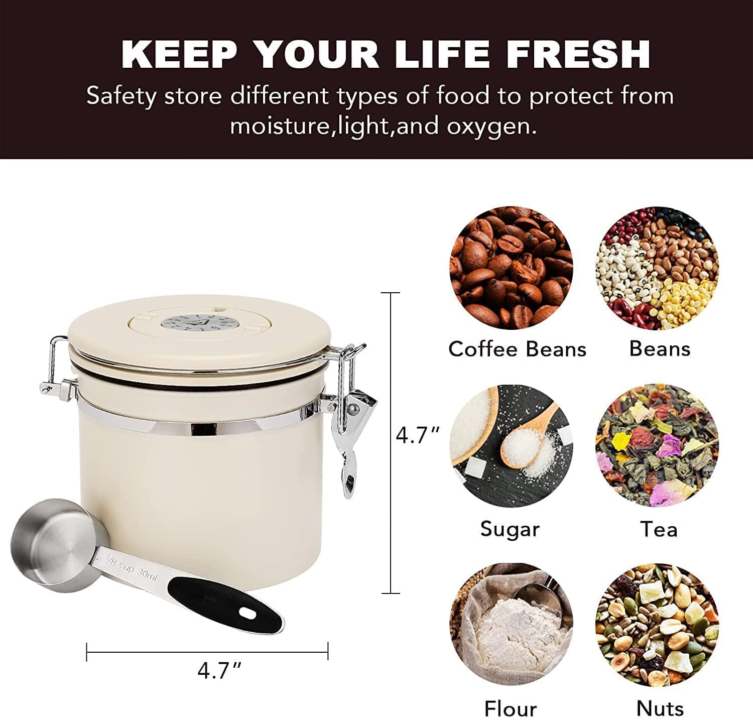 • 【STAINLESS STEEL COFFEE CONTAINER】Made from high-quality 304 stainless steel, the opaque body creates an ideal environment for storing coffee beans. The canister blocks out light and moisture to protect your ingredients—whether they’re coffee beans, dried nuts, or other pantry staples.Its robust construction offers long-lasting durability.