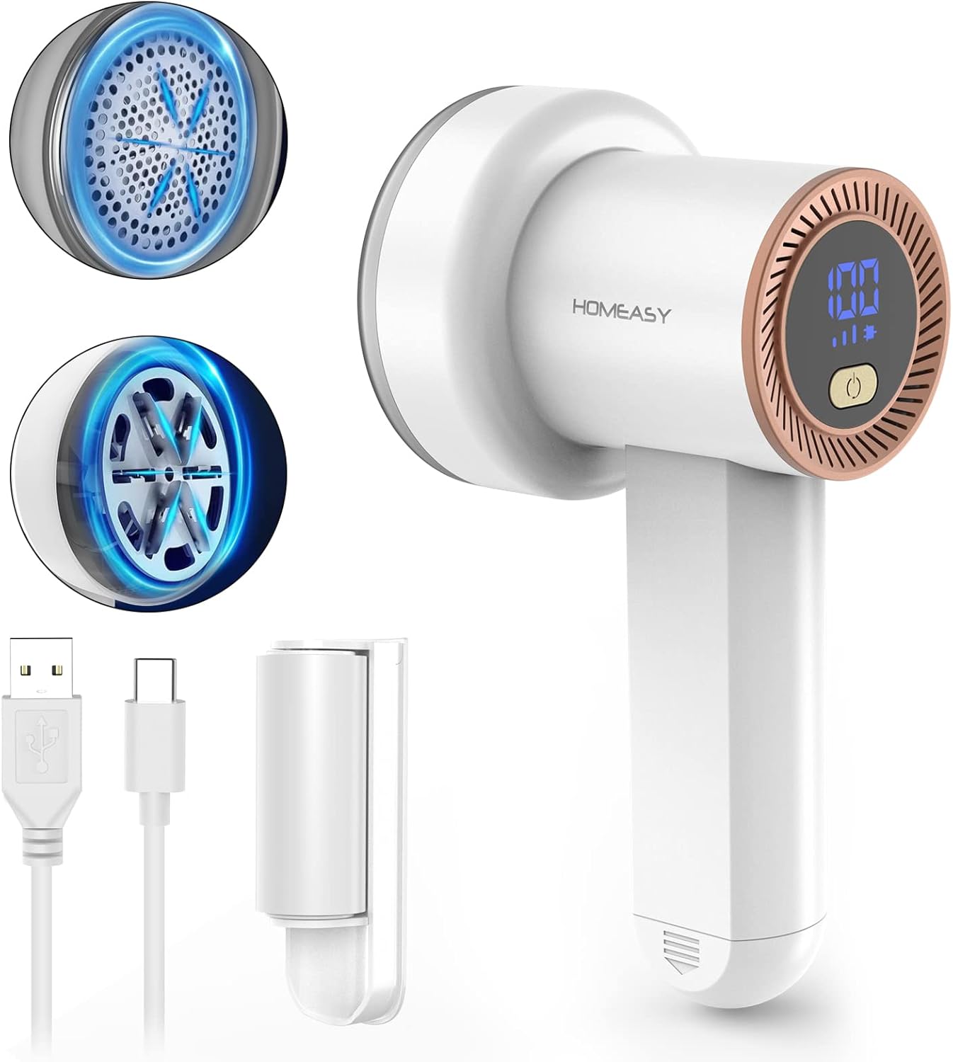 Fabric Shaver Fuzz Remover Rechargeable, HOMEASY Electric Lint Remover Shaver with 3 Blades & LED Digital Display, Sweater Couch Fabric Pill Shaver for Sweater, Couch, Furniture (White)