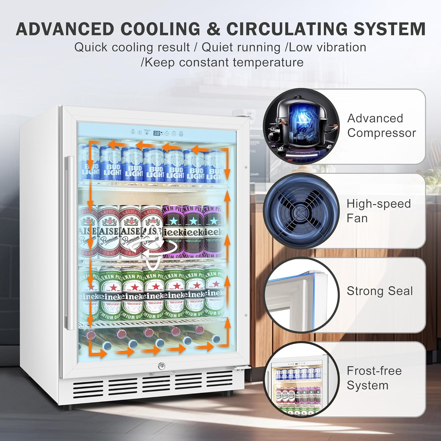 • Efficient Cooling System: Designed with an advanced cooling and circulating system, this fridge ensures quick cooling results. Its high-speed fan and strong seal maintain a constant temperature for optimal beverage preservation