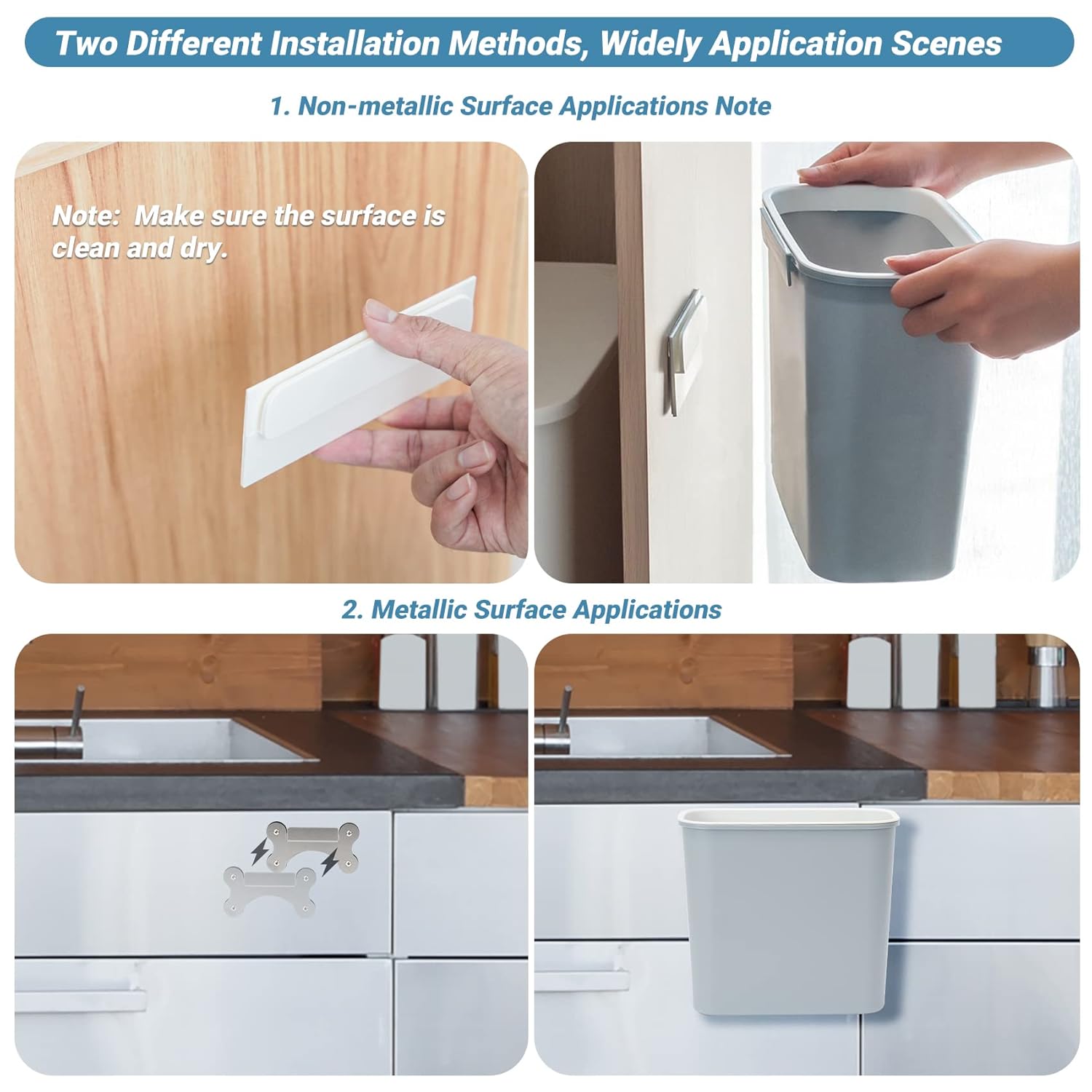 • Two Installation Options - Come with two different installation methods accessories. The first one is a strong magnetic holder, which can easily attach to metal surfaces. The second one is an adhesive patch and hook, you can stick it anywhere you want after rip off the adhesive strip, then easily hang the trash can.