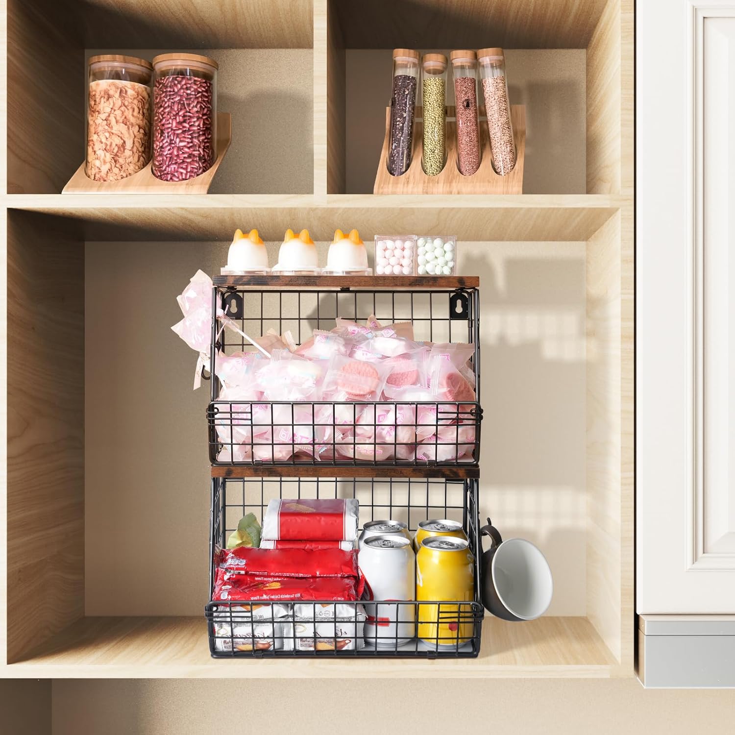 • Package and Size: 2 Stacking storage baskets with wood lid, Suitable for countertop organizer, pantry organizer, snack organizer, fruit and vegetable storage etc. Kitchen countertop organizer size: 11.8 inch x 7.9 inch x 8.5 inch