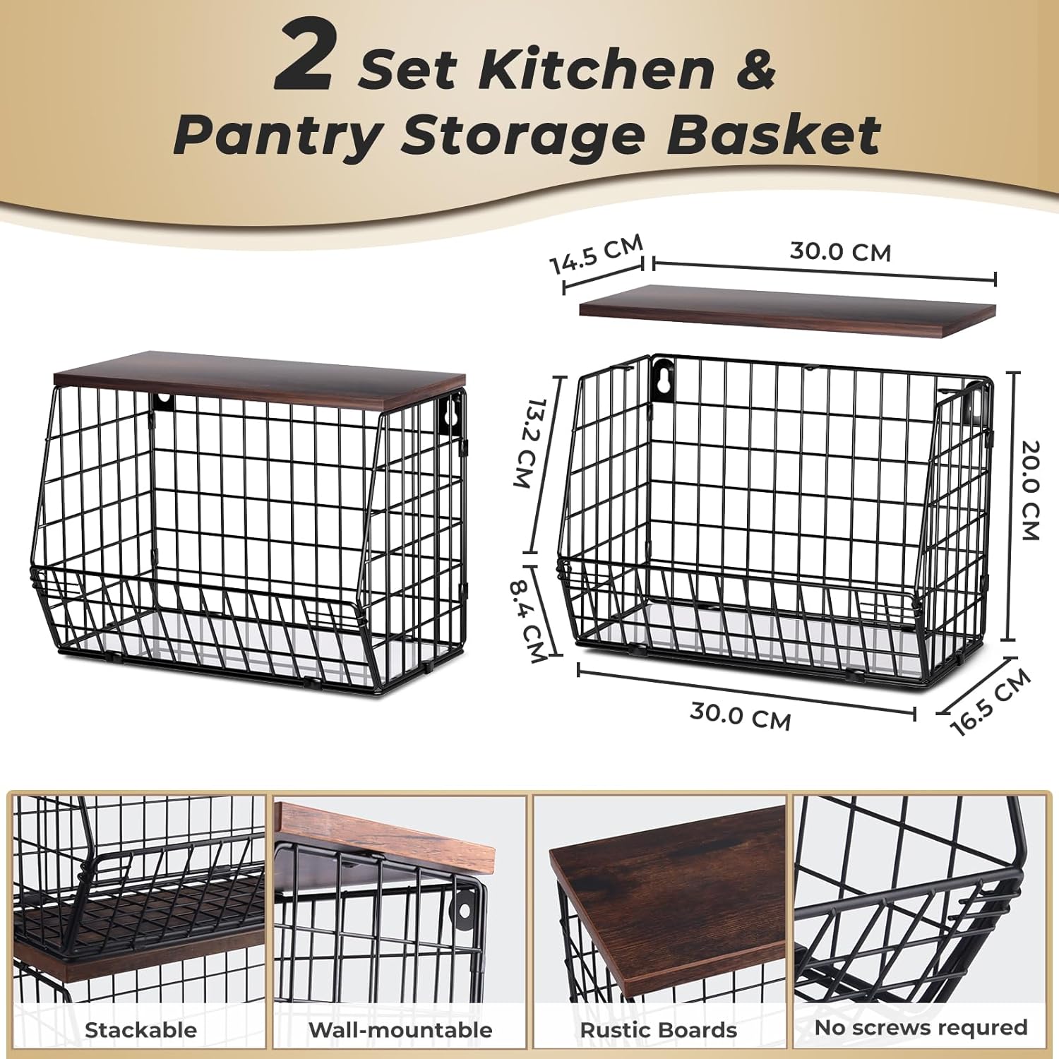 • Stackable & Wall-mounted Metal Basket: Our hanging basket not only can stackable or countertop tiered use, but also can hang in the wall to maximize save your space. Storage baskets wood lid top add more storage room to put some small things like seasoning jar, magazine, office supplies, toiletries for bathroom etc