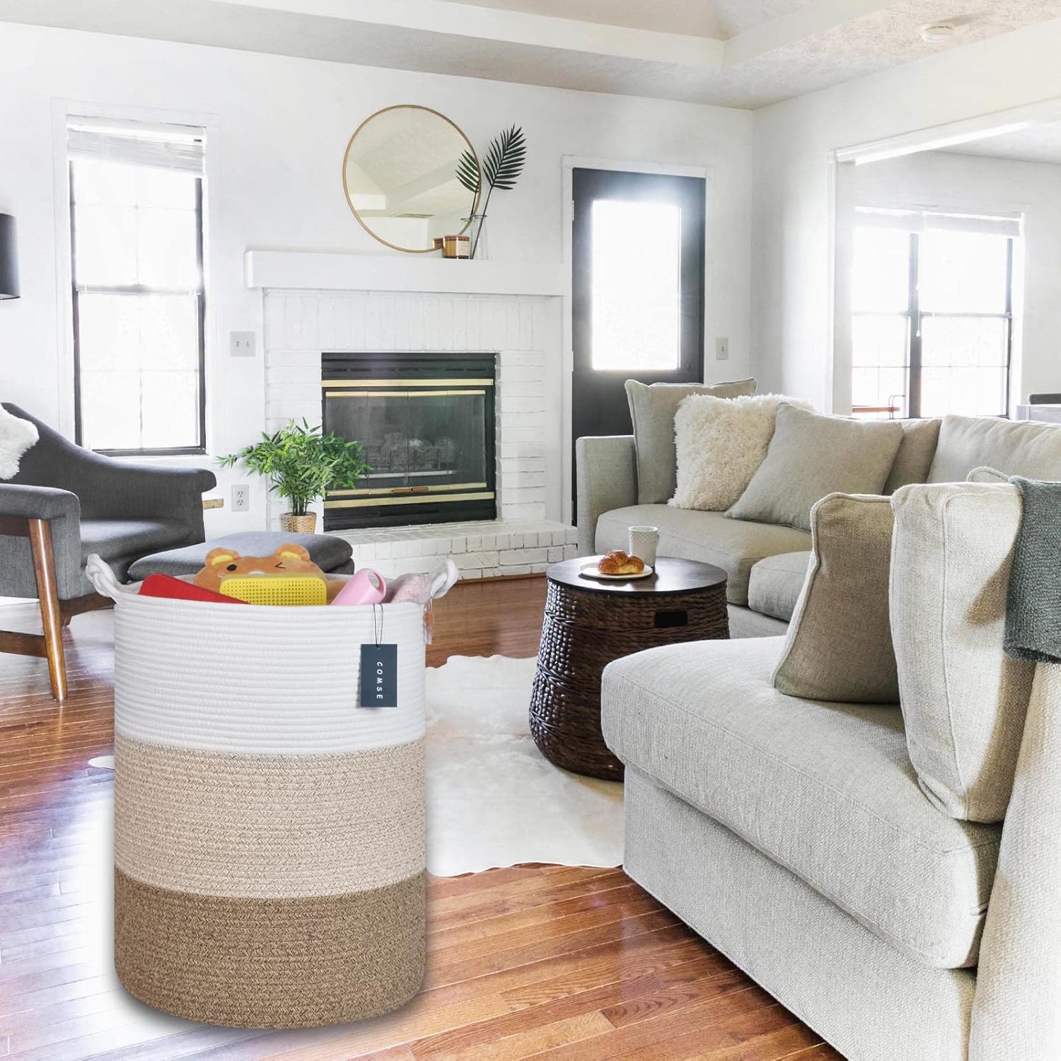COMSE Extra Large Blanket Basket, Tall Woven Storage Basket, Nursery Hamper, 15.7”x 21.7”, Cotton Rope Laundry Hamper for Toys Clothes Towels, White/Gradient Brown
