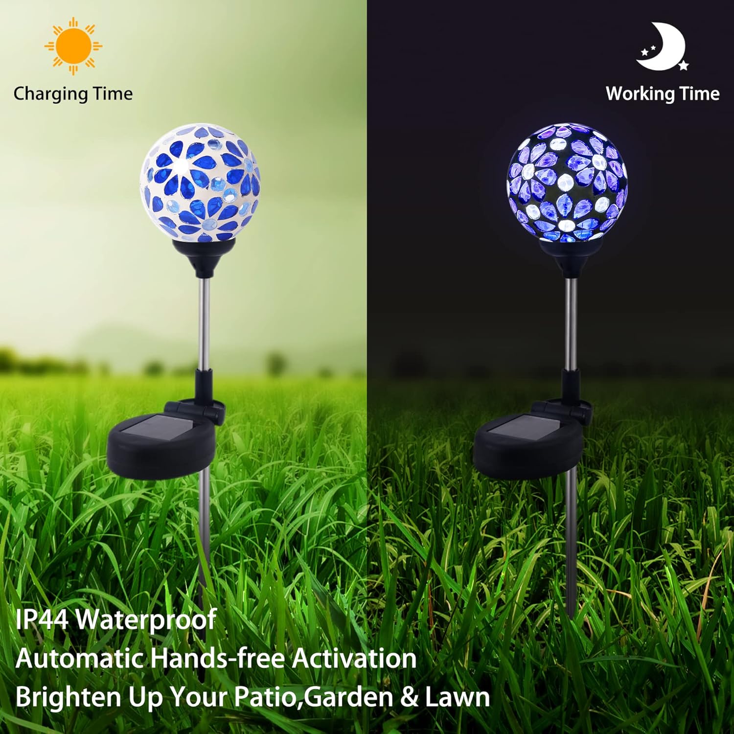 • 【CLASSIC MOSAIC PATTERN】---Outdoor Solar Lights are handmade with a classic pattern and perfect design, they can glow in the dark and the light will make your mood happy and light up your garden and yard!These solar mosaic glass ball stake lights add amazing color around your garden.