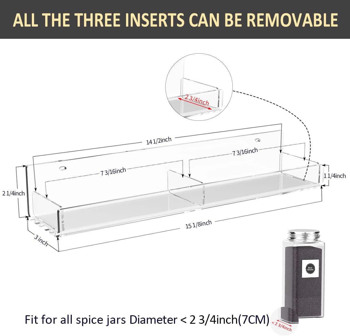 • WHAT YOU WILL GET : 4 clear acrylic spice rack with 12 barriers, one marker, 8 sets of screws and anchors, one screwdriver and a small level. W15 1/8'' x D3'' x H2 1/4'' in 4mm thickness which would be very stable to ensure your safety when fixed into the wall. You only need to drill two holes on the wall or cabinet door and fix the shelves by screwdriver.