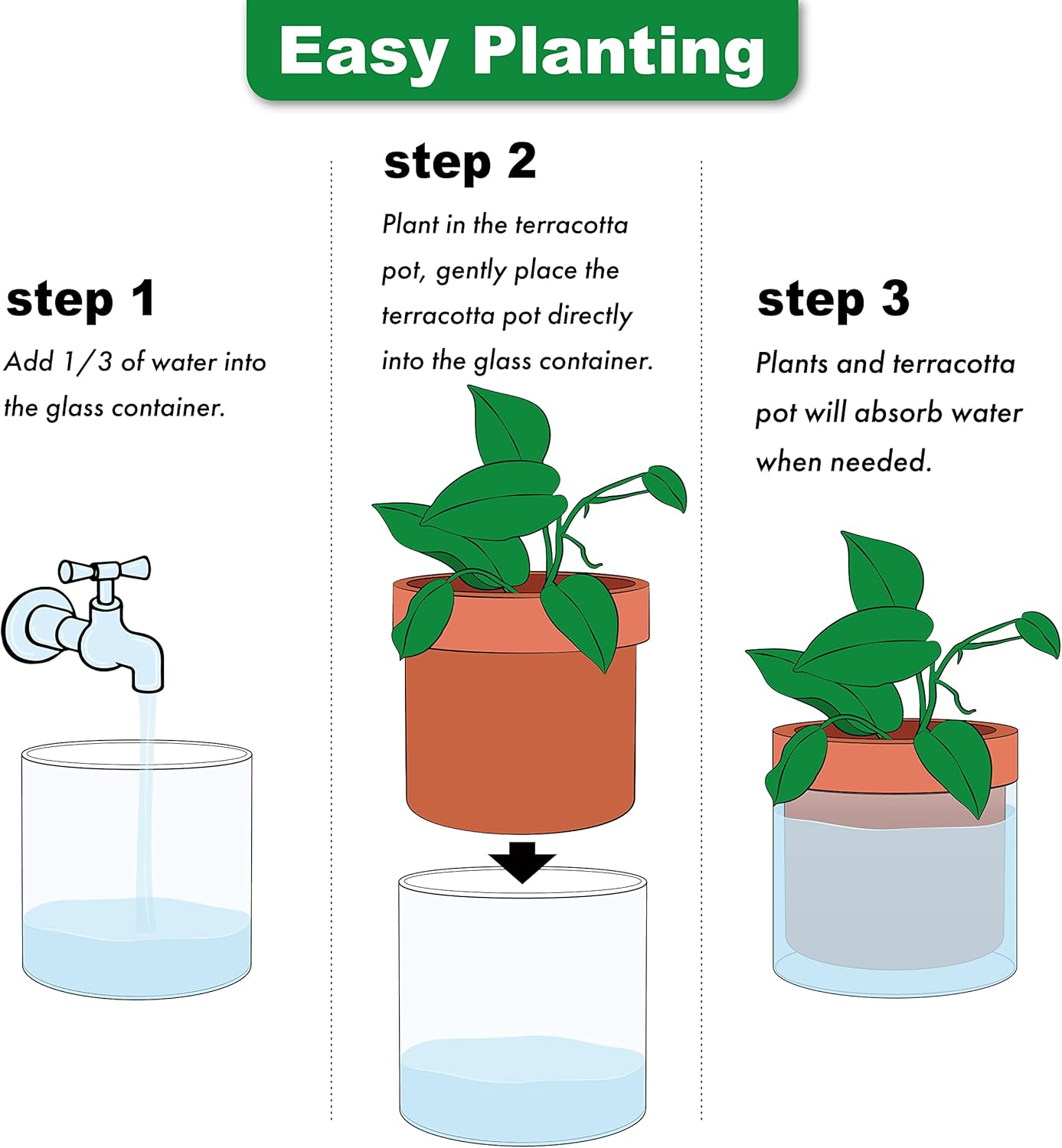 • Self-Watering System: The bottom quarter of the terracotta pot is unglazed, allowing plants to absorb water through the pot walls.
