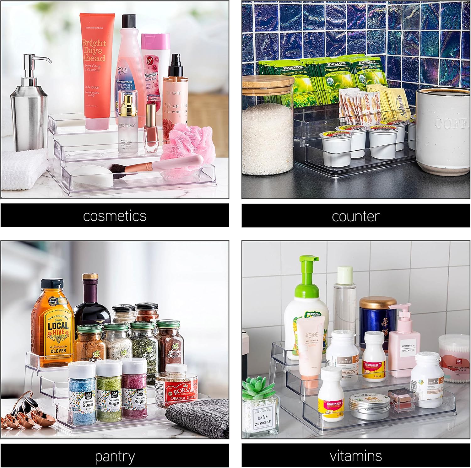 • SET INCLUDES: This rack has three tiers to increase visibility and easy access to the items on your kitchen counter or cabinets. Deep shelves helps to prevent spills from spreading. Dimensions are: 10.5" x 9.5" x 4.25"