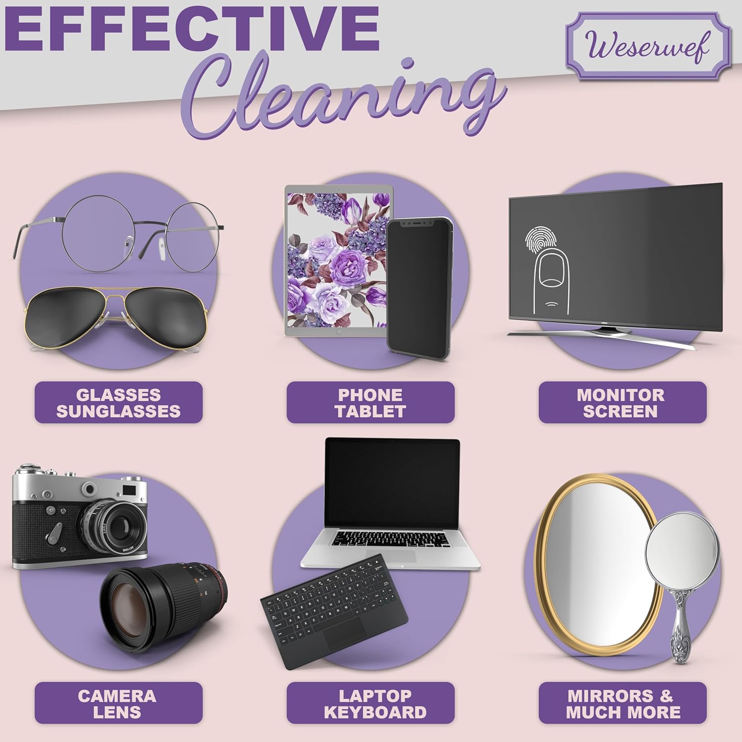 • VERSATILE SCREEN & LENS CLEANER FOR ALL DEVICES: Designed for universal use, this multi-purpose cleaning cloth is ideal for eyeglasses, lenses, smartphones, tablets, laptops, TVs, VR headsets, gaming monitors, binoculars, and more. Whether you need a professional camera lens cleaner, a streak-free phone screen wipe, or a gentle microfiber cloth for delicate optics, Weserwef delivers superior performance across all surfaces.