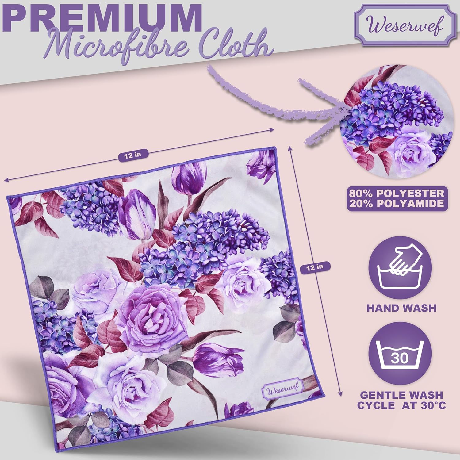 WESERWEF Design Microfiber Glasses Cleaning Cloth – Premium Cleaning Cloth for Eyeglasses, Screens, Tablets, Cameras & Lenses, 12" x 12", Ultra-Soft & Scratch-Free (Rose and Lilac)