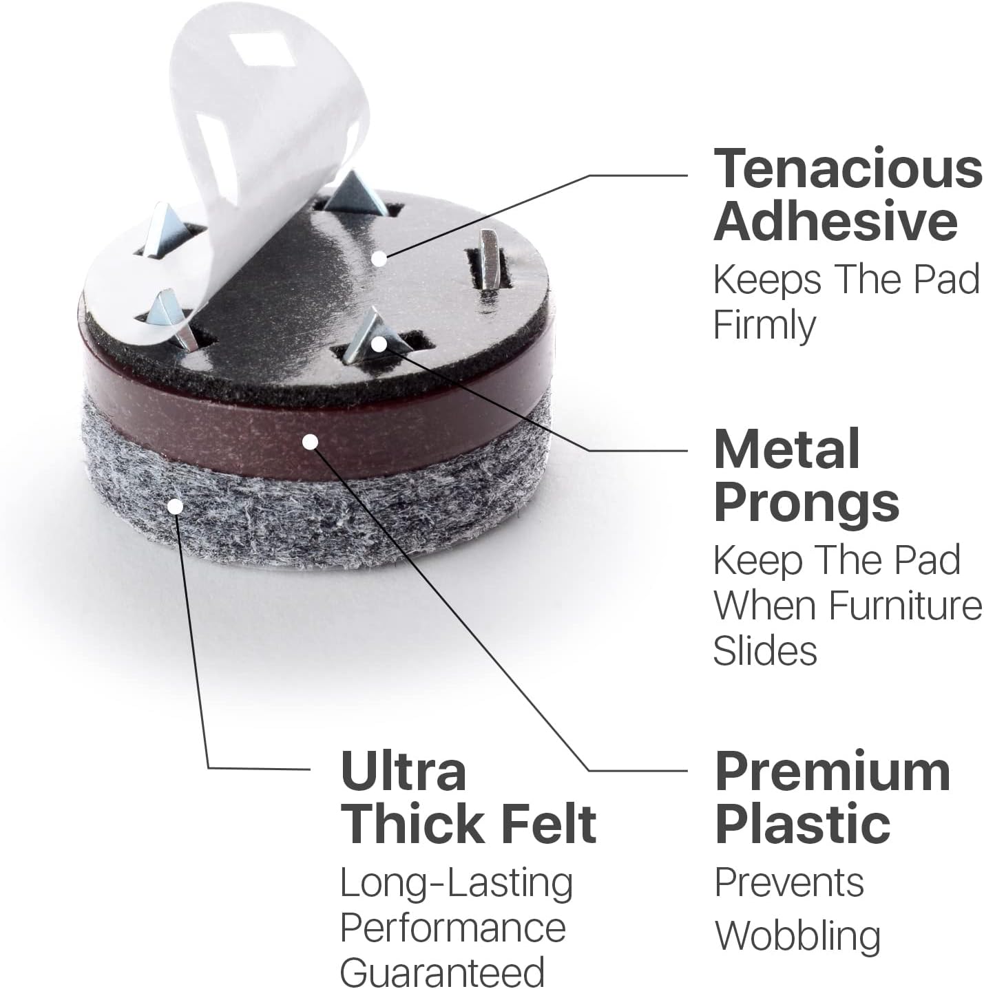 • ✌️ PREMIUM MATERIALS - 16 PCS Furniture Felt Pads consist of Thick Felt, Safe Plastic, Tenacious Adhesive, and Metal Prongs - THIS COMBINATION CREATES STRONG SHIELD BETWEEN FLOOR AND FURNITURE!