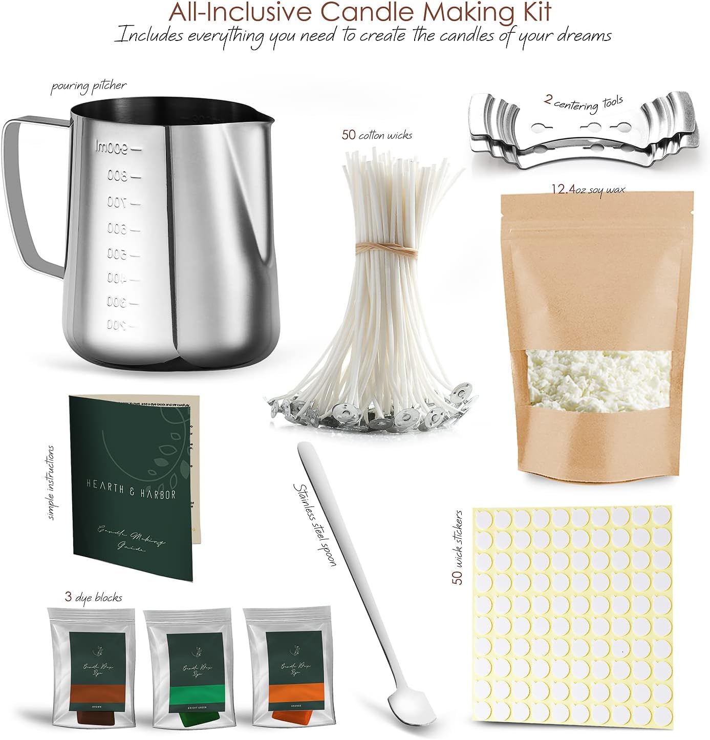 • SOY CANDLE MAKING KIT FOR ADULTS: Make your own candles with our candle making supplies kit: natural soy wax for candle making 12.4 oz bag, 3 dye blocks, 50 cotton candle wicks for candle making, 50 candle wick stickers, 2 wick holders, 900 ml melting pot, and stirring spoon.