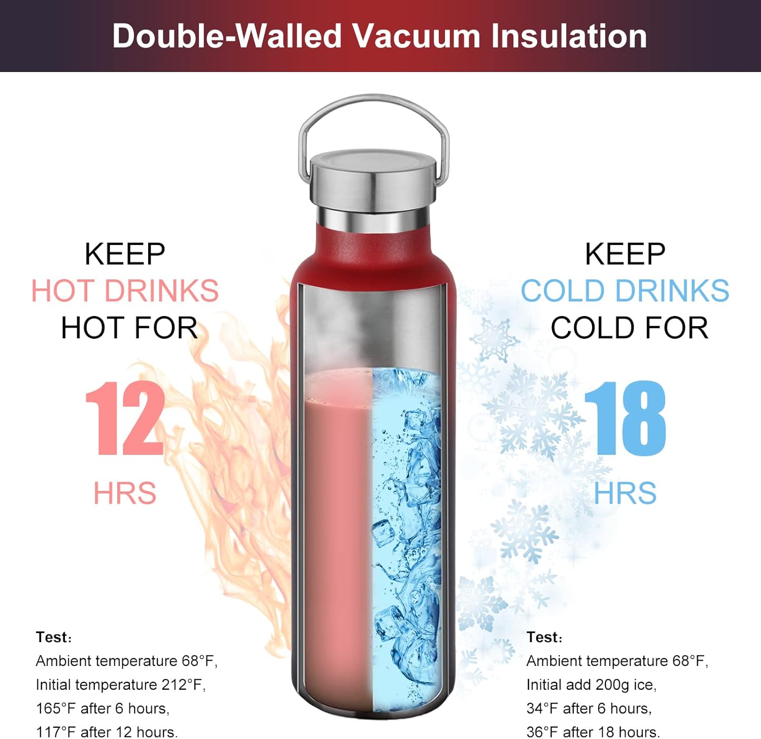 • PERFECT SIZE AND KEEP WARM FOR A LONG TIME: Our double wall insulation bottle protects temperature for up to 12 hours . The 20 oz stainless steel water bottle is perfect for everyday use and the cups fit on the bike cup holder and inside the backpack for your hiking, biking, beach, camping and fitness