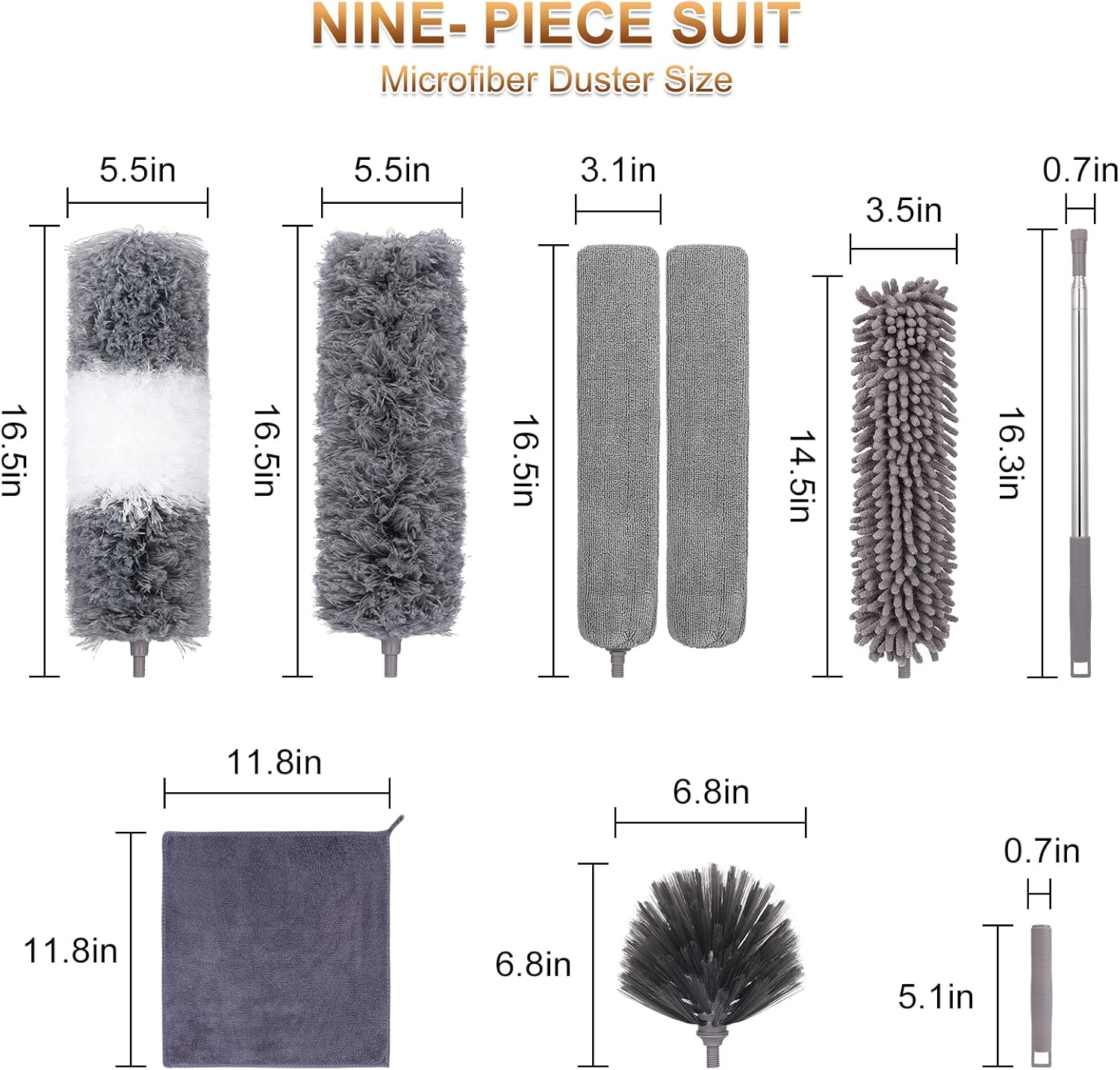 • 【Upgraded 9 Pcs Dusters Kit】: This multifunction dusters for cleaning kit includes a extendable long pole and a mini pole, 2 bendable microfiber duster head,1 chenille duster head, 1crevice brush, 2 flat brush dust cloth, 1cobweb duster head. Replacing different types of duster brush heads which can easily allows you to clean hard-reach any places, contains everything you will need to clean your home from floor to ceiling, keeping your home away from dust.