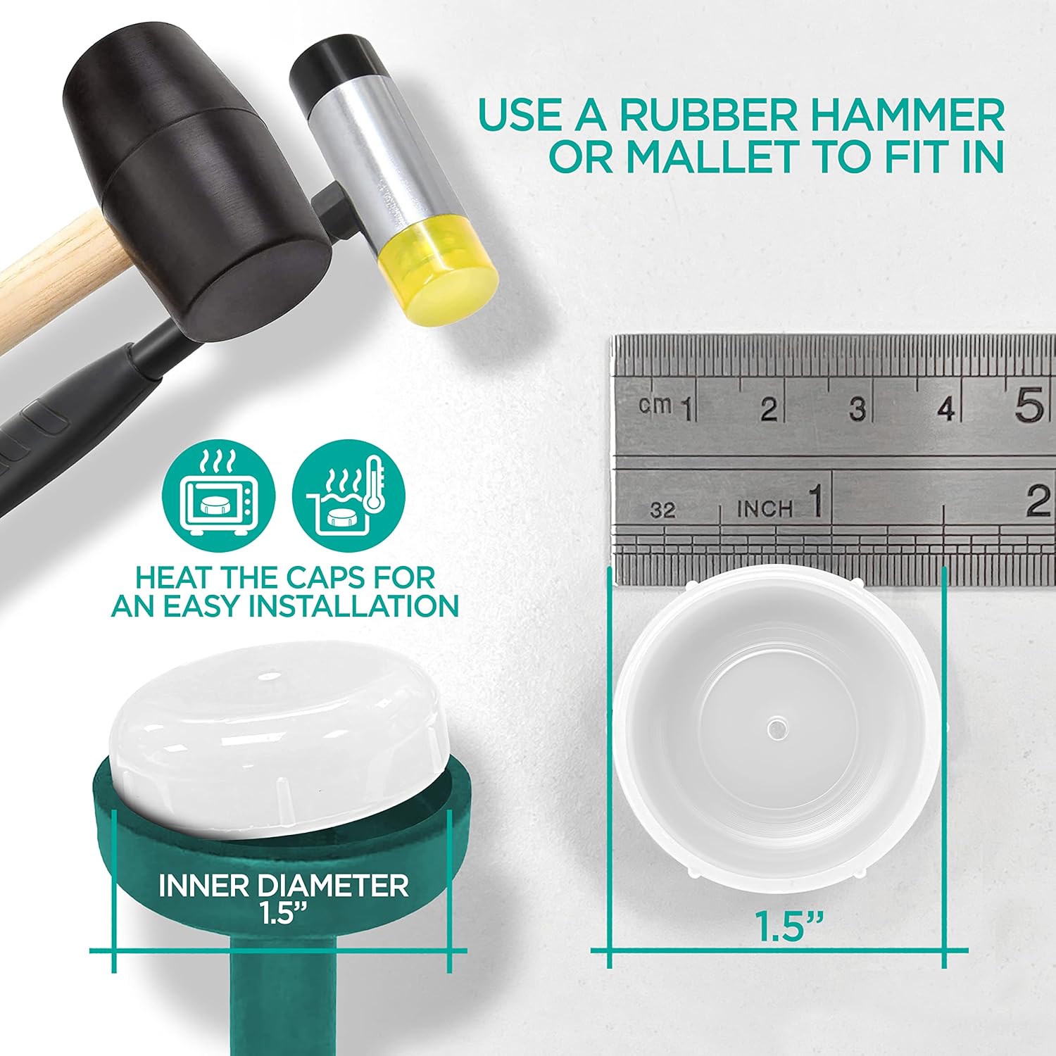 • A Breeze To Install - These round caps are meant to fit snugly onto chair legs with an inner diameter of 1.5”. Simply pop them into your furniture’s feet and hit using a rubber hammer or a mallet.