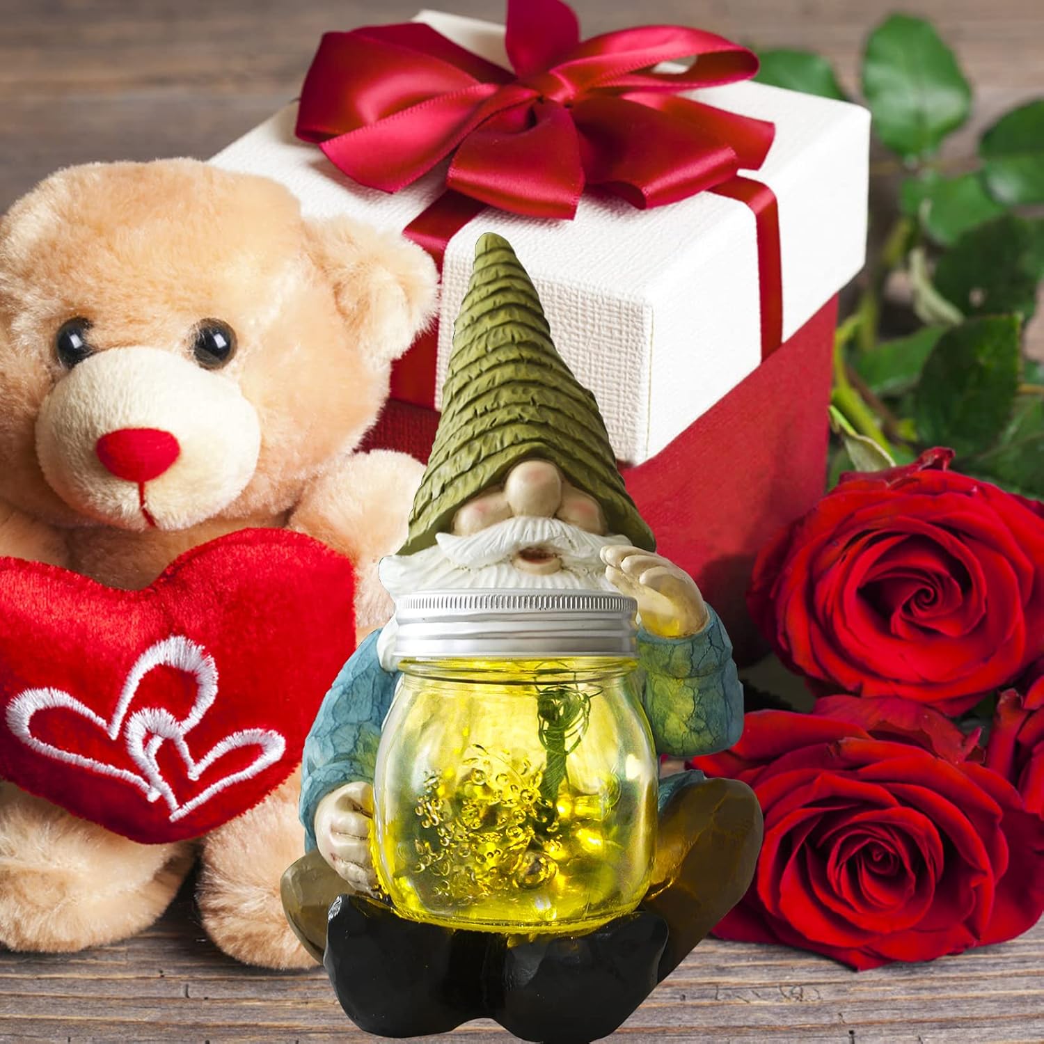 • Firefly Jar Garden Gnome Decor : The funny solar elf resin statue holding a mason jar which contain glowing fireflies, these fireflies are vivid and realistic firefly shaped led bulbs with yellower-green lights, when the lights light up at night, it brings you back to your childhood, records your memories of chasing fireflies