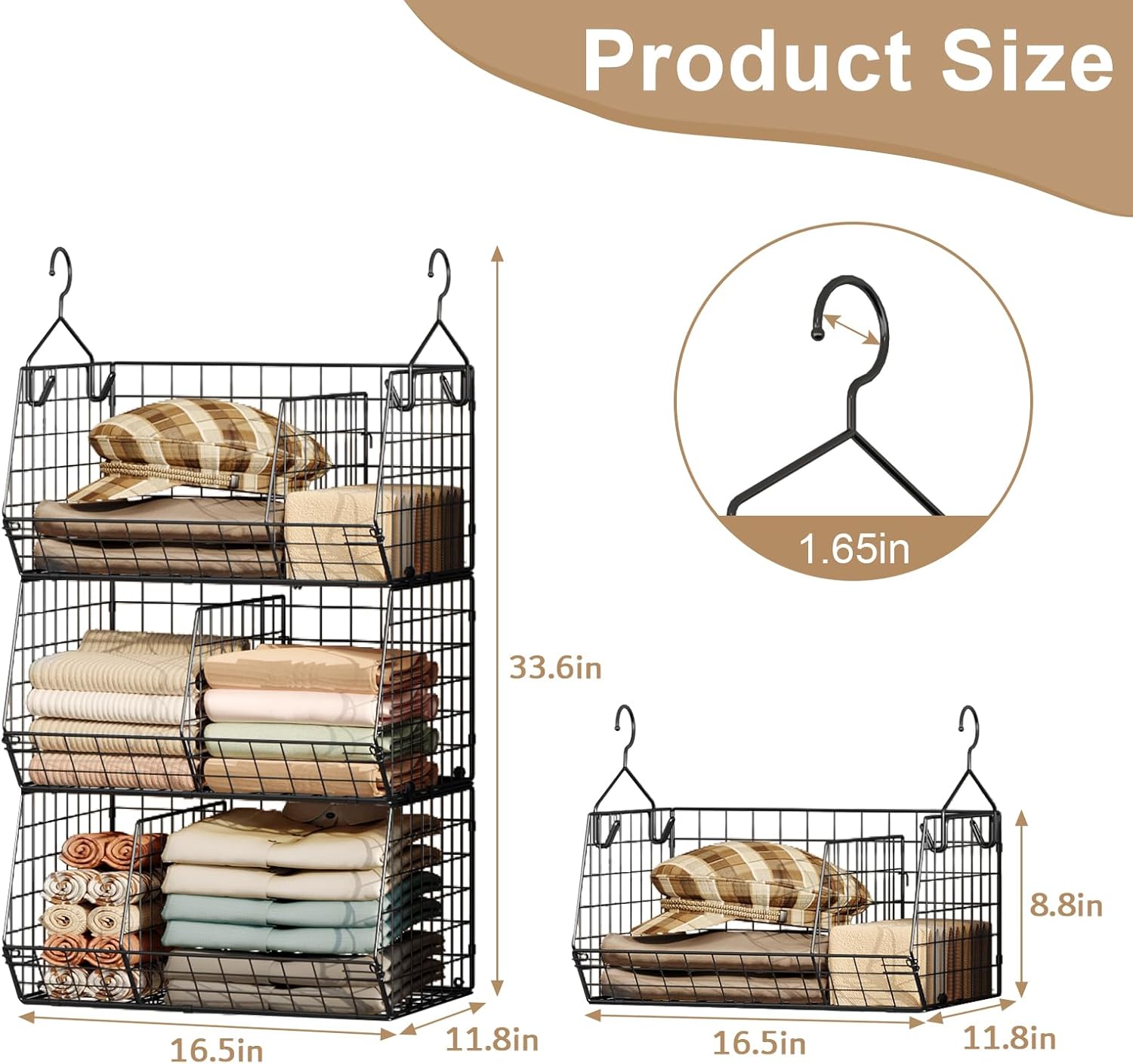 • 3 in 1 or Use Alone: Closet hanging organizer is the layered design, used alone or stacked according to your own need and idea. And you can screw all the three baskets together and hang them as a unit on the closet rod to store clothes, hats, sweaters, jeans, shirts, shoes, purses and other accessories. Also, you can hang 2 baskets on the wall, and place 1 on the shelf. You can DIY the using methods.