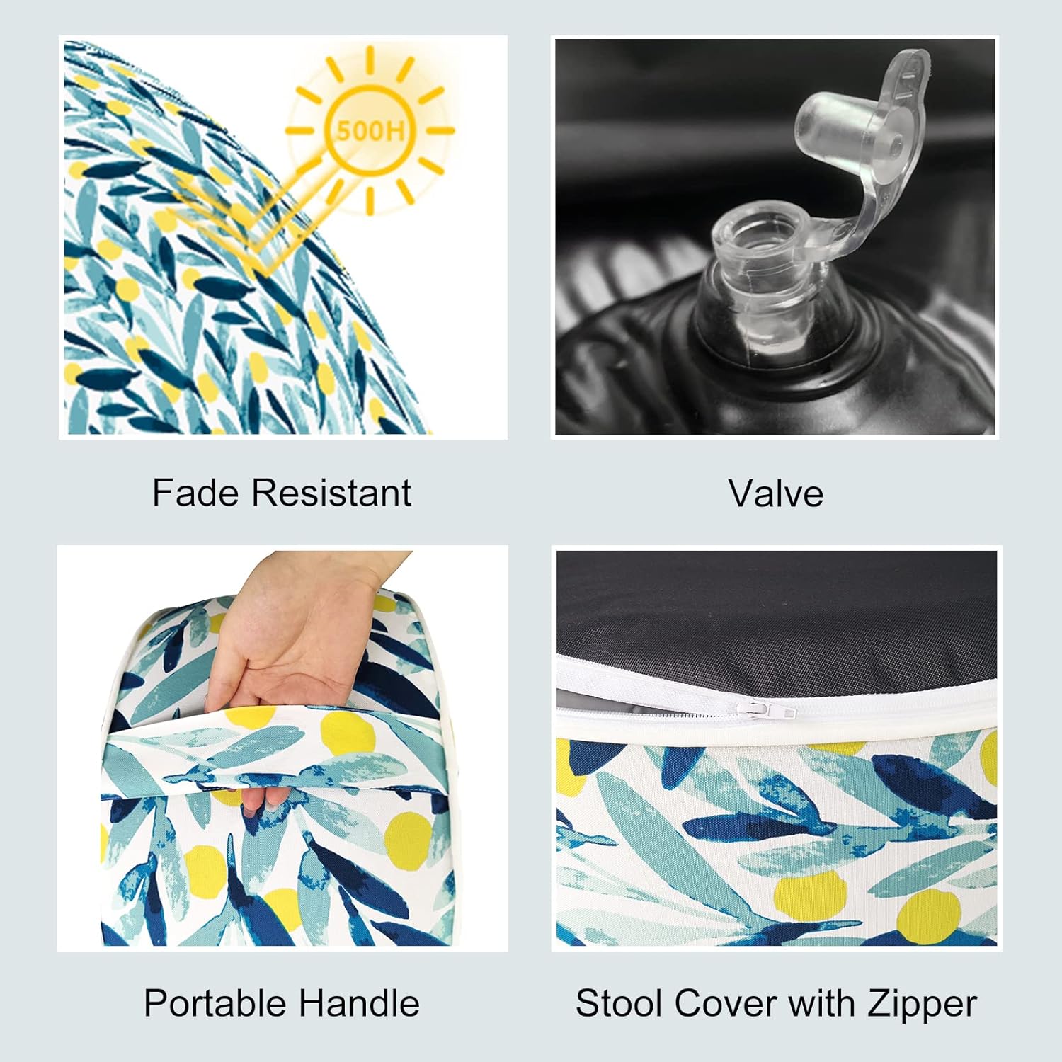 LVTXIII Outdoor/Indoor Inflatable Stool Ottoman, All Weather Patio Footrest Pouf, Portable Round Ottoman for Patio Garden, Camping or Home, D21xH9 Inches, Blue Leaves