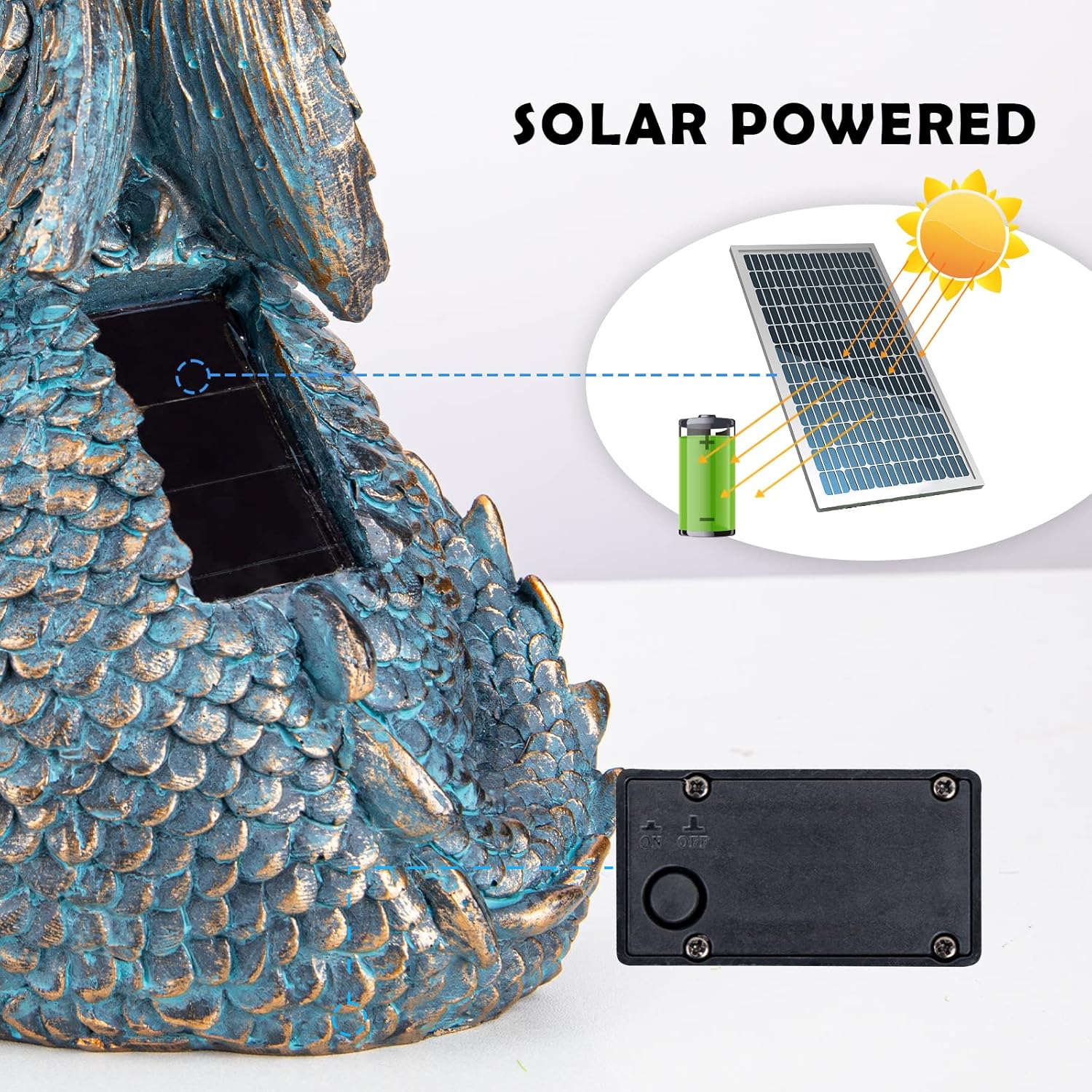• Exquisite Details: Garden statues and figurines made of resin material with hand carved. Dragon statue has waterproof solar panels, suitable for all weather conditions