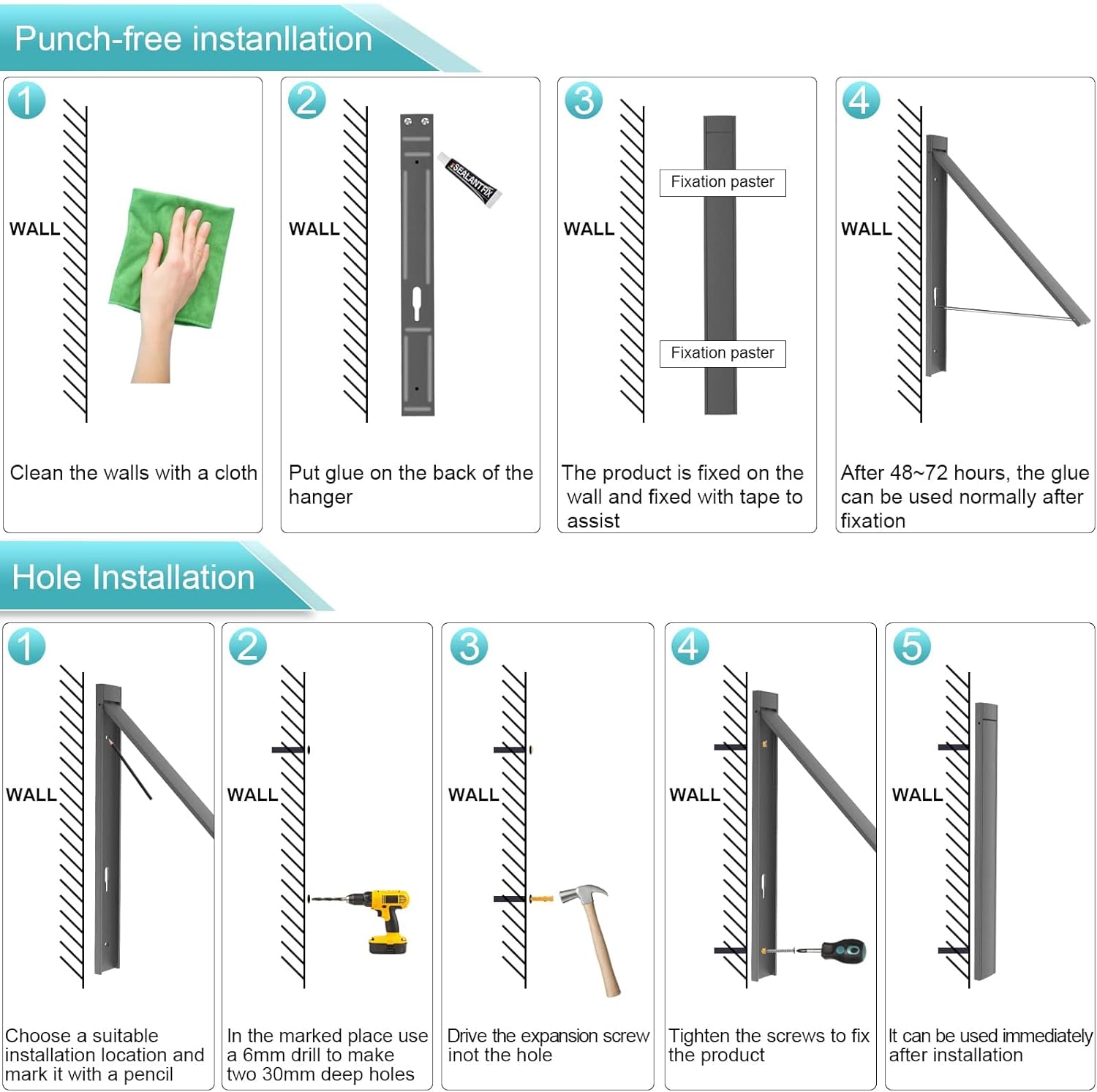 • EASY INSTALLATION:We provide you with two installation methods, if you install the drying rack on the door, glass, tile wall and other smooth walls, you do not need to punch, we provide you with nail free glue. If you want to mount a folding hanger on a lime wall, we provide you with two screws.