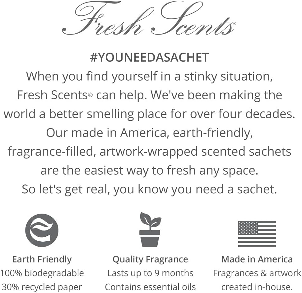 • FRESH SCENTS SACHETS, Set of 3. Made in the U.S.A. with biodegradable materials. Fresh Scents scented sachets are made of a non-toxic blend of naturally occurring materials and fragrance. The natural material used is extracted from the soil and is very porous to allow for maximum fragrance absorption. This allows our sachets to diffuse fragrance for up to 4 months.