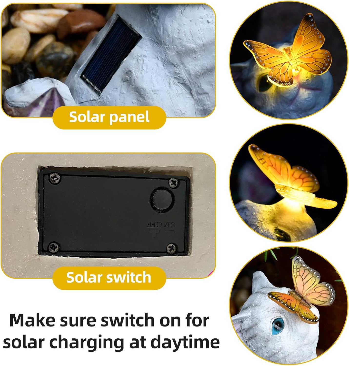 • ▶ Durable and Waterproof - This outdoor solar cat garden statue decor can withstand all types of weather conditions including heavy rain and snow. Cat figurines made of high-grade resin, you don't need to worry about color-fading or water leaking.