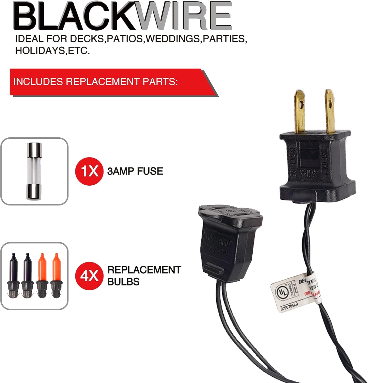 • Dimensions and Package Includes: 2 x 20-foot light string, 2 x spare fuse, 8 x additional incandescent bulbs. The length of the Halloween mini transparent light string is 18.5 feet, and the lead is 1.5 feet. Length between bulbs: 6.5 cm / 2.55 inch.