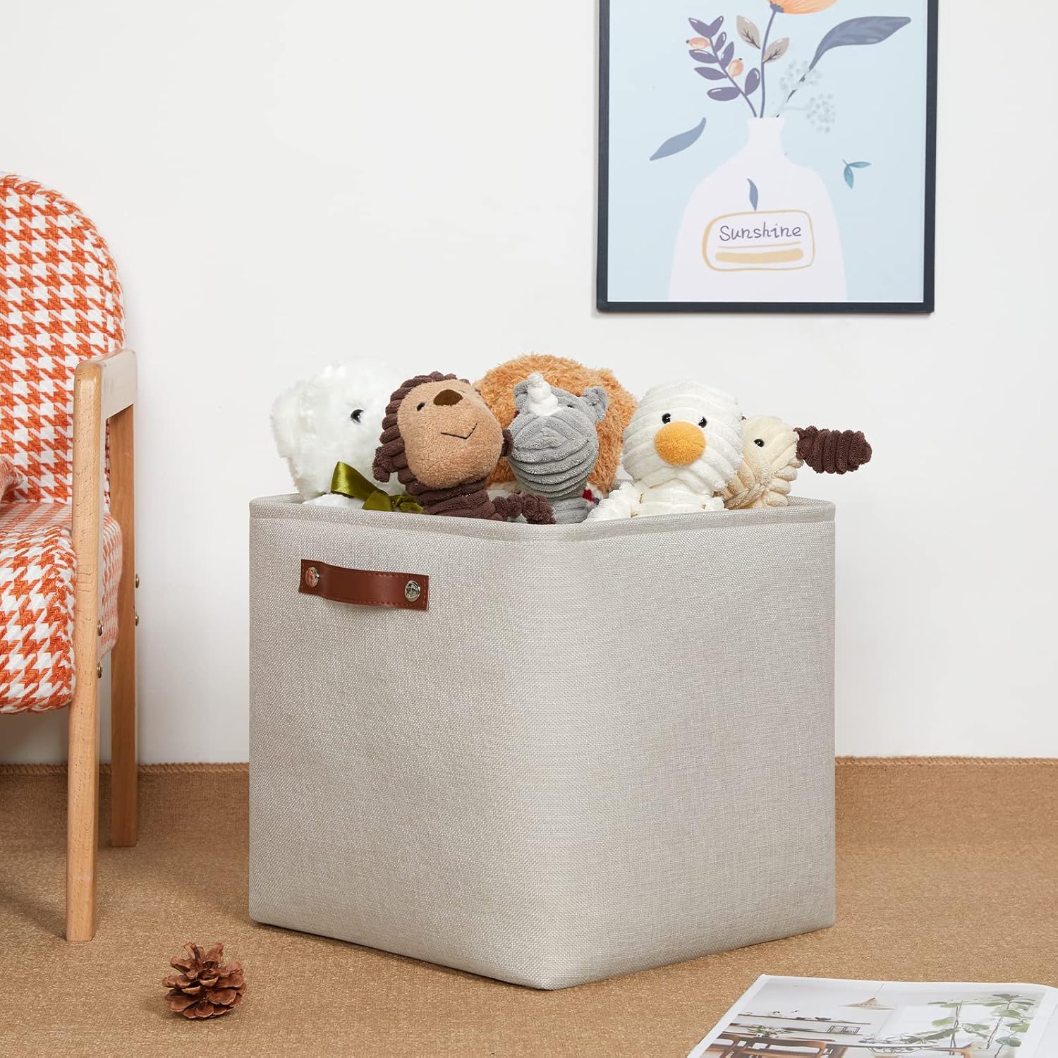 DULLEMELO Storage Bins, 4 Pack Of 13x13x13 Decorative Storage Cube Bins Suit Office, Home, Shelves And Closet, Cube Storage Bin with Leather handle(4 Pack - 13" Beige)