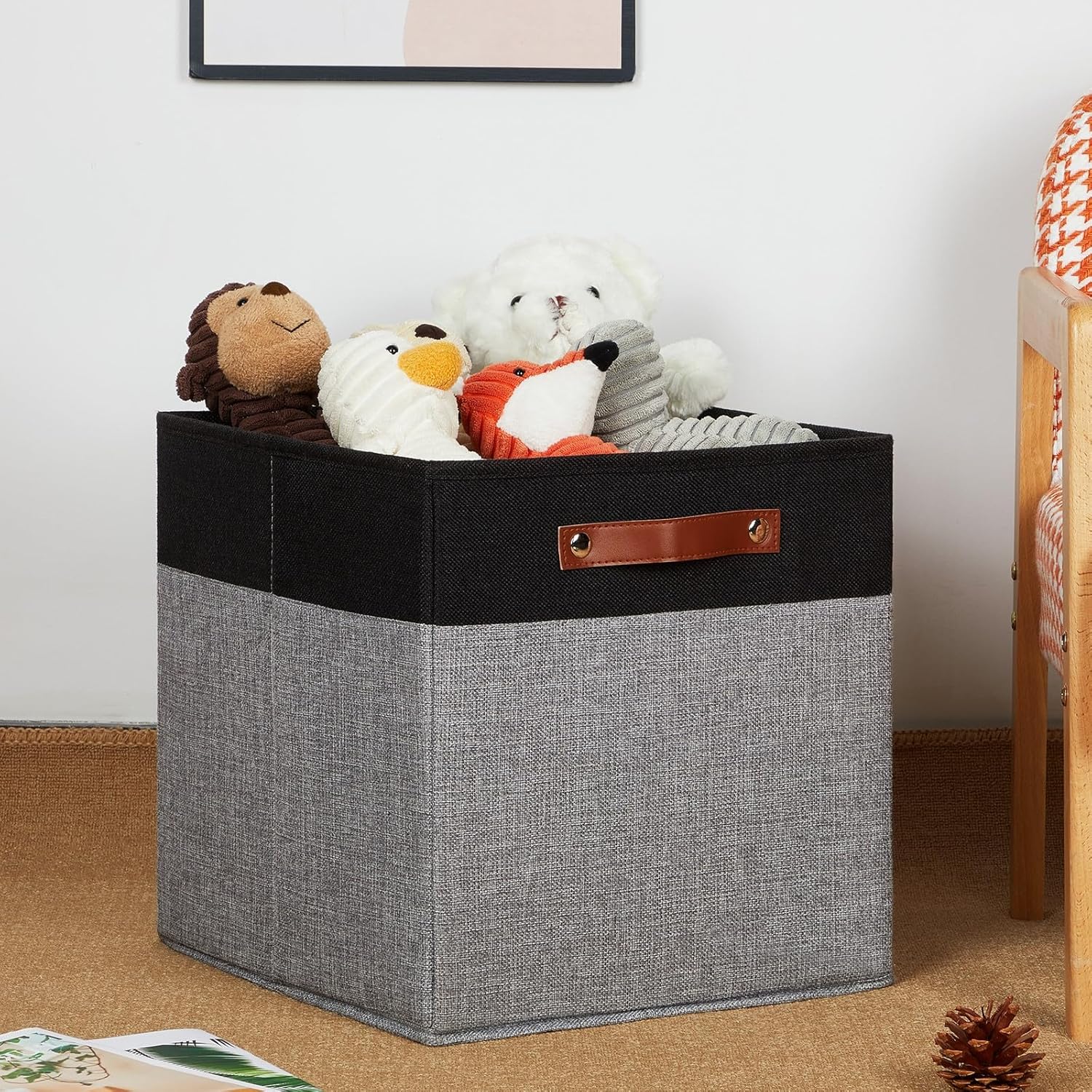 • 【Sturdy Leather Handles】Sturdy thickened leather handles and metal iron buckles make bins for cube organizer easy to carry even with a heavy load. Cardboard is inserted at the bottom and sides to provide support, so that these decorative fabric storage bin to stand on, holding the shape well and can be used for a long time