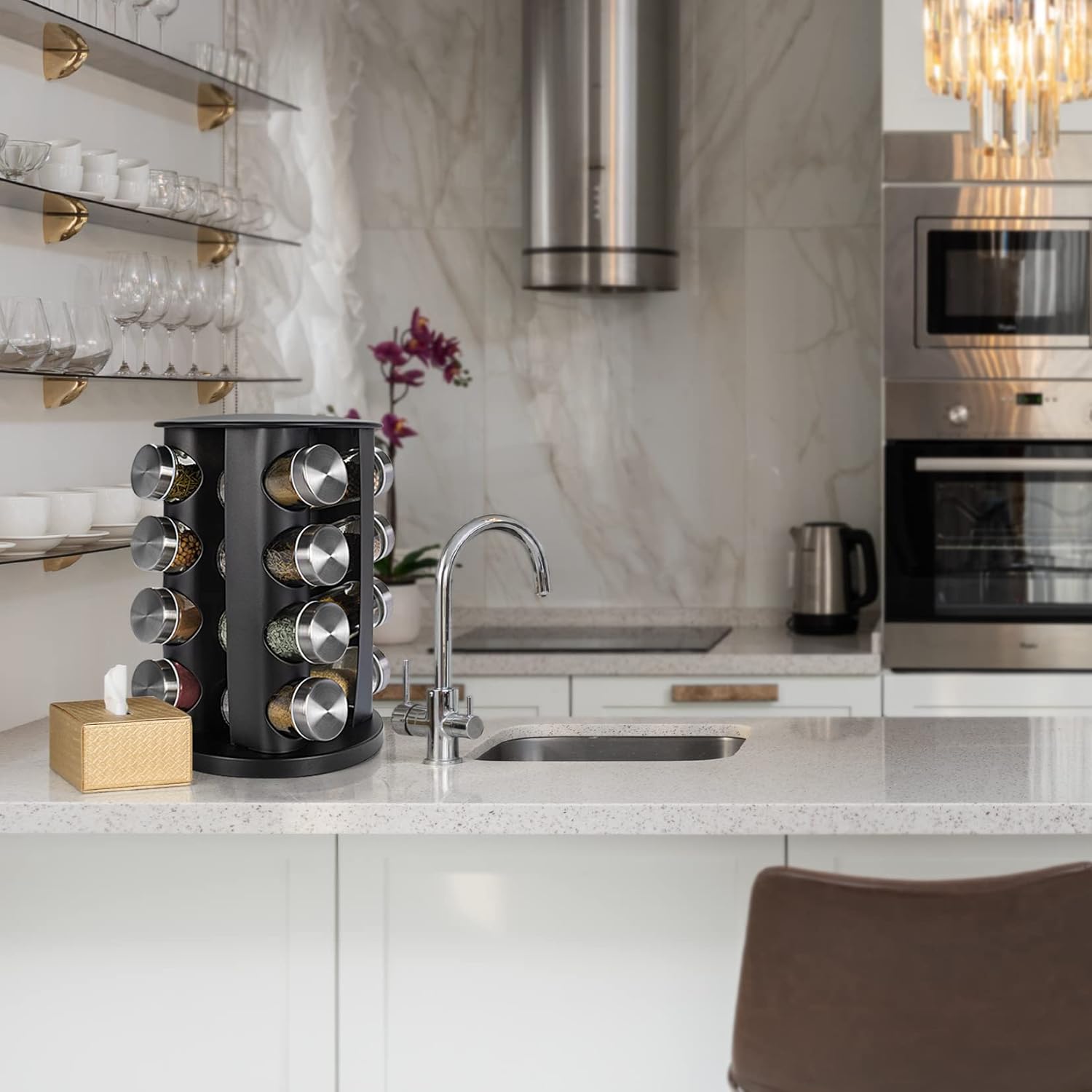 • PERFECT FOR YOUR KITCHEN AND DECORATION - The spice rack can be used in homes, restaurants and party buffets to enhance the ease of use and practicality of meals. The unique exterior design is also very eye-catching, no need to hide in the cabinet, no matter what your interior style, the spice organizer is a great decoration accessory for your kitchen. It is also a great gift idea.
