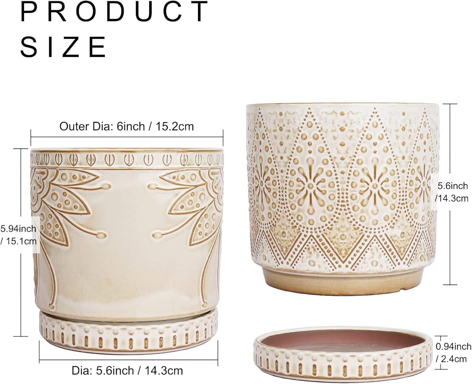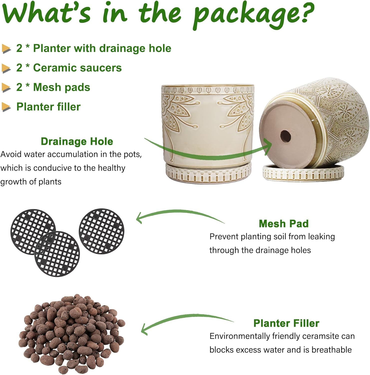 • Size & Package : 6 Inches set of 2. Package: contains 2 ceramic flower pots, 2 ceramic saucers and 2 mesh pads(NOT INCLUDE PLANTS)