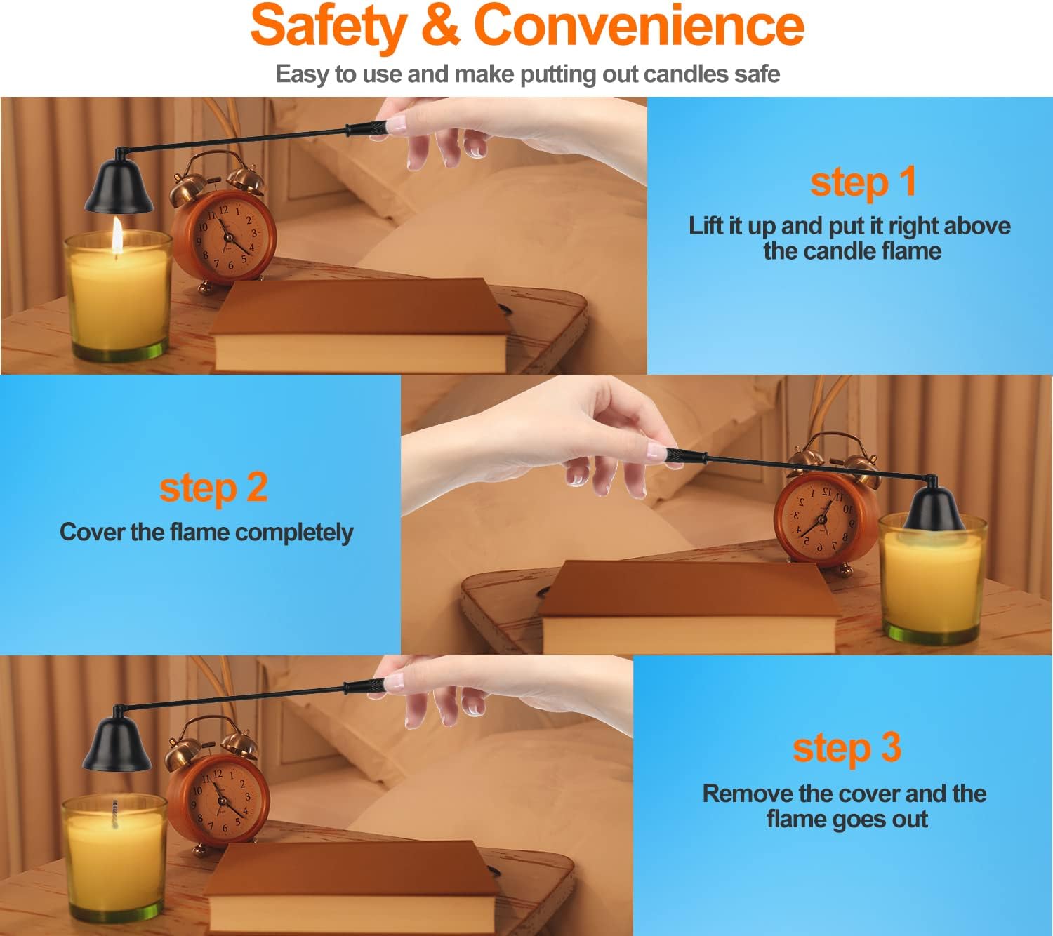 • EASY TO USE:No more blowing out candles. Just need to hold the candle stopper and lower the bell over the flame, the flame is extinguished immediately. Makes putting out candles safer than blowing it directly.