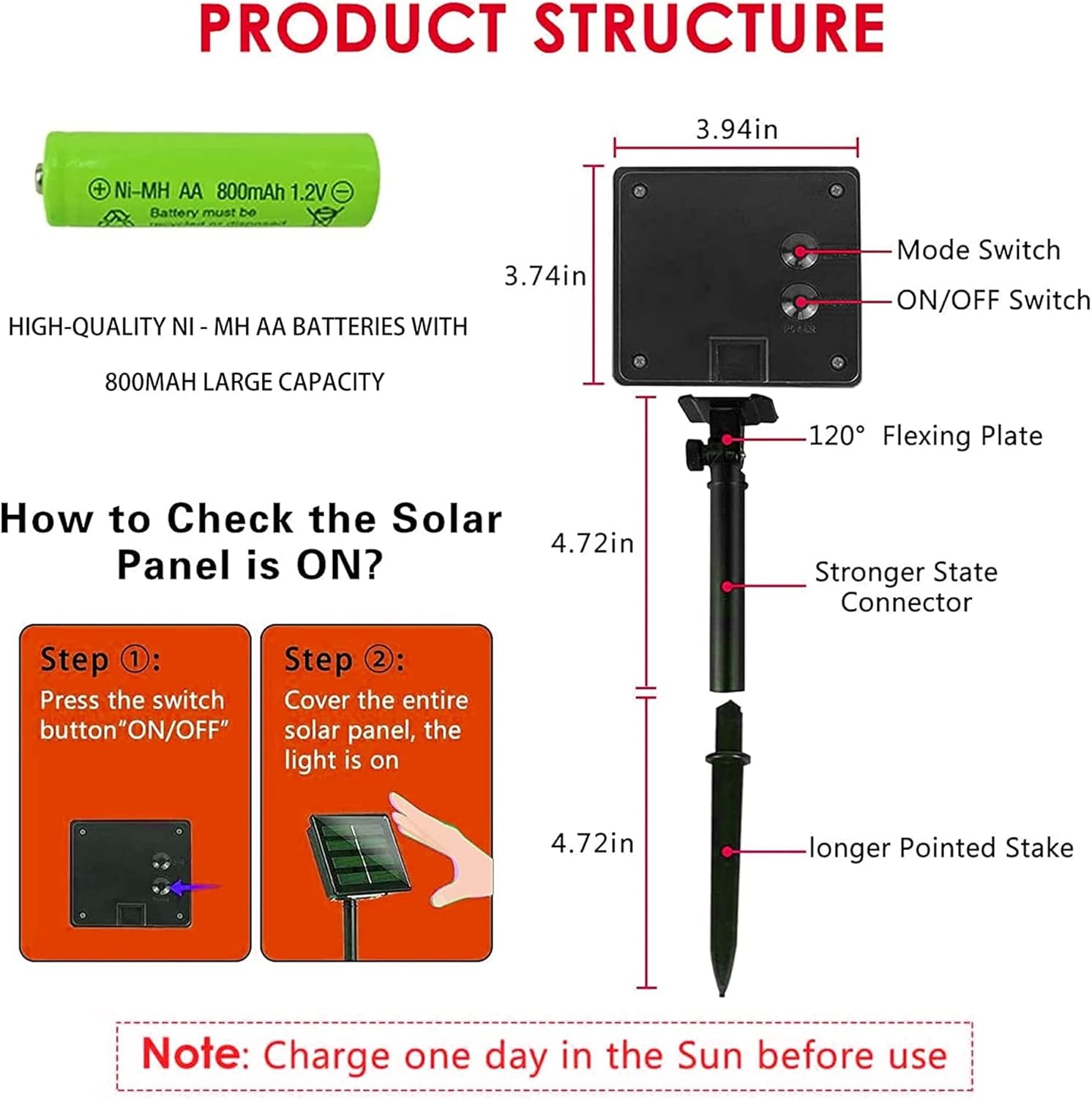 • Solar Powered Garden Lights: Powered by solar, it can work for 10 to 12 hrs after fully charged (The charging efficiency depends on the weather). Each solar panel is equipped with Ni-MH AA 800m AH battery, which has large capacity for whole night lighting require. Please turn on switch at the back of solar panel before charging and the lights will be auto on at night, auto-off during the daytime.