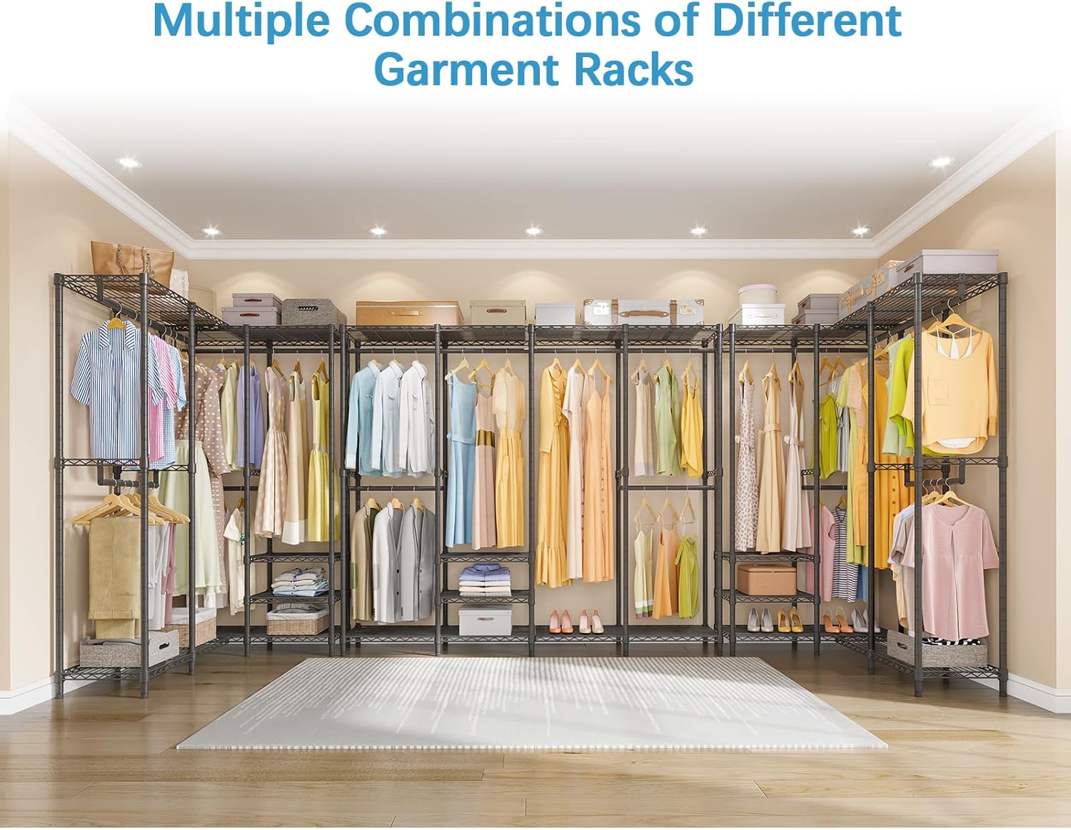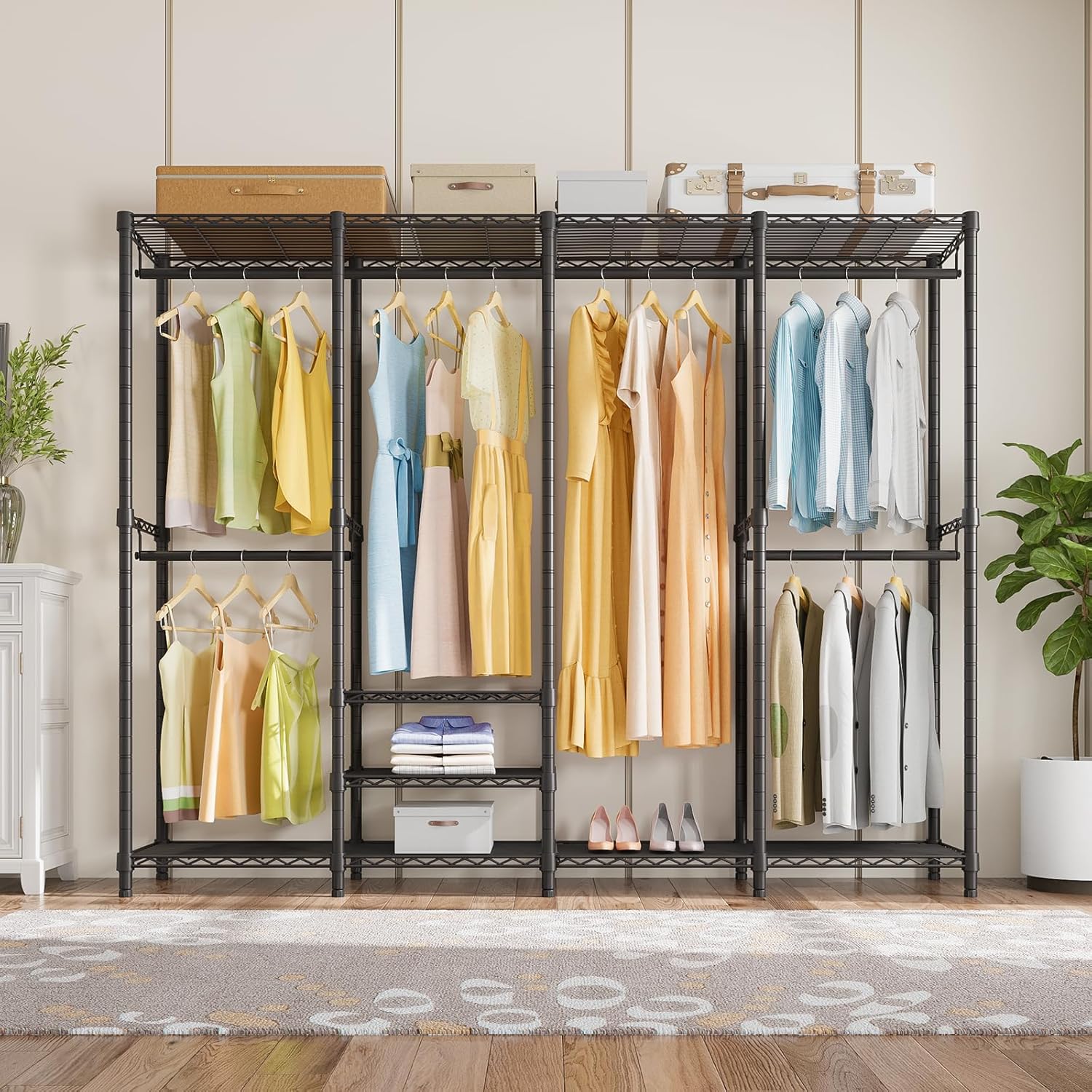 • All-in-one Multifunction Closet Rack: 4 Tiers Extra Large Garment Rack V40 offers you various storage area to place your clothes, accessories, shoes, etc. It features 6 height adjustable shelves for extra storage capacity, 4 detachable hanging bars that easily accommodates to the length and size of your garments.