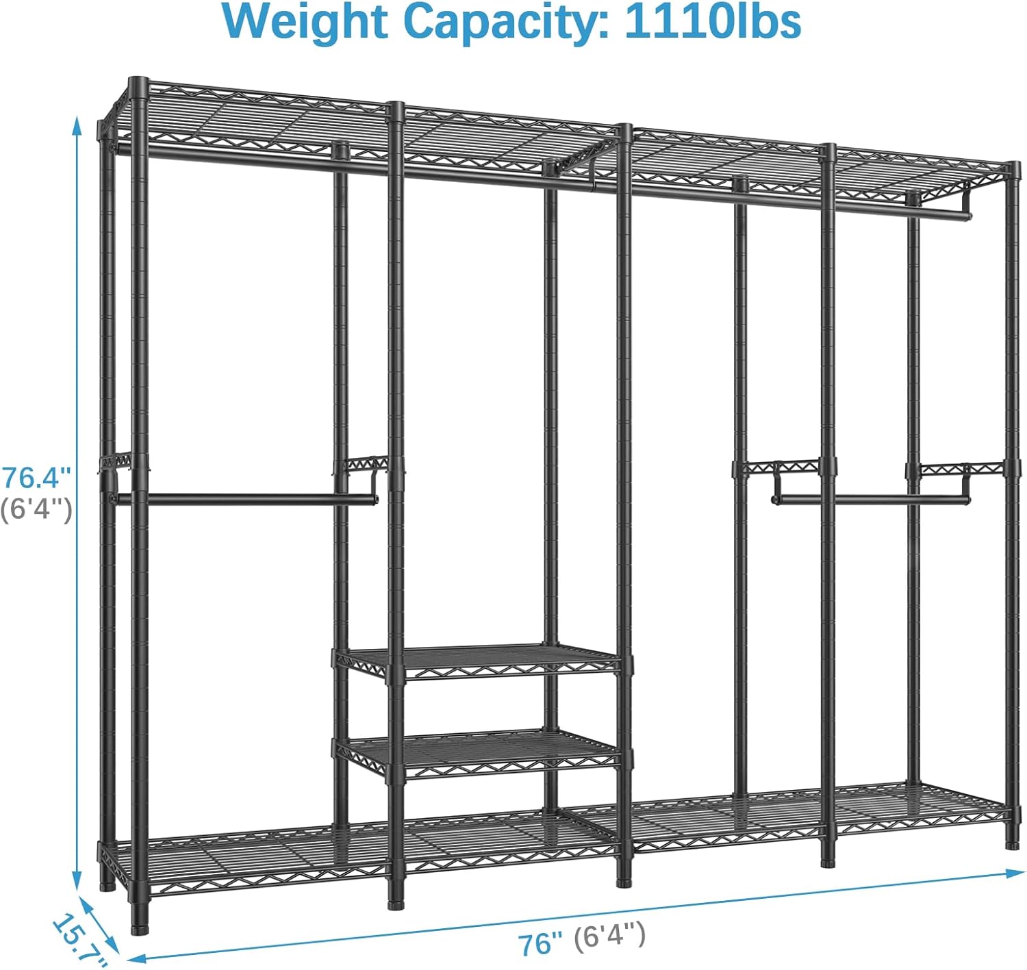 • Dimensions & Load Capacity: 76" L x 15.7" W x 76.4" H. Load capacity up to 1110 lbs. Single hanging rod can support up to 75 lbs, wire shelf can support up to 88 lbs for each.