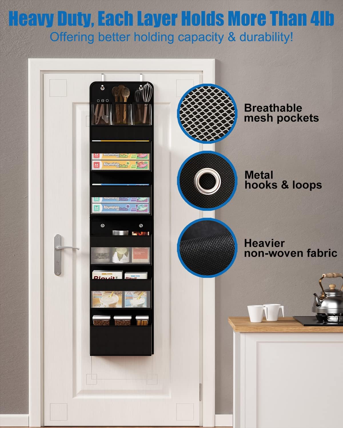 • - Premium Material: Thicker cardboard, heavier non-woven fabric, metal hooks, and loops offer better holding capacity & durability