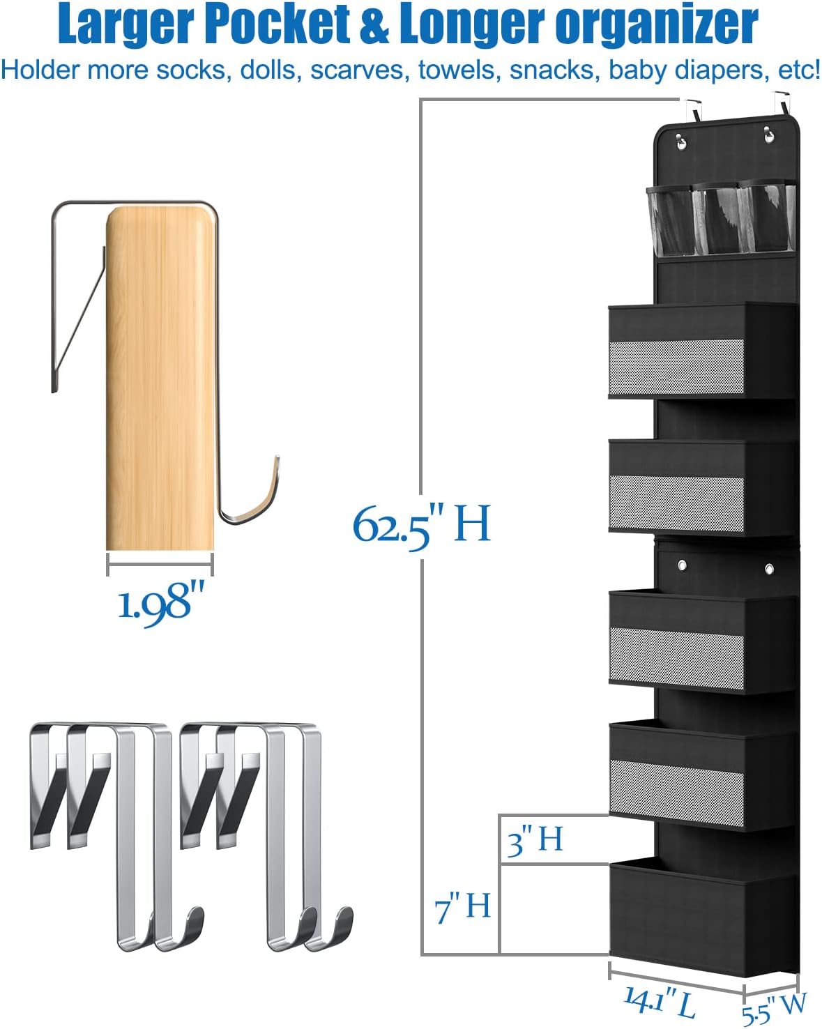 • - Length Expended: Storage more with 62.5 inches length to fits most door & fully used the space behind the door