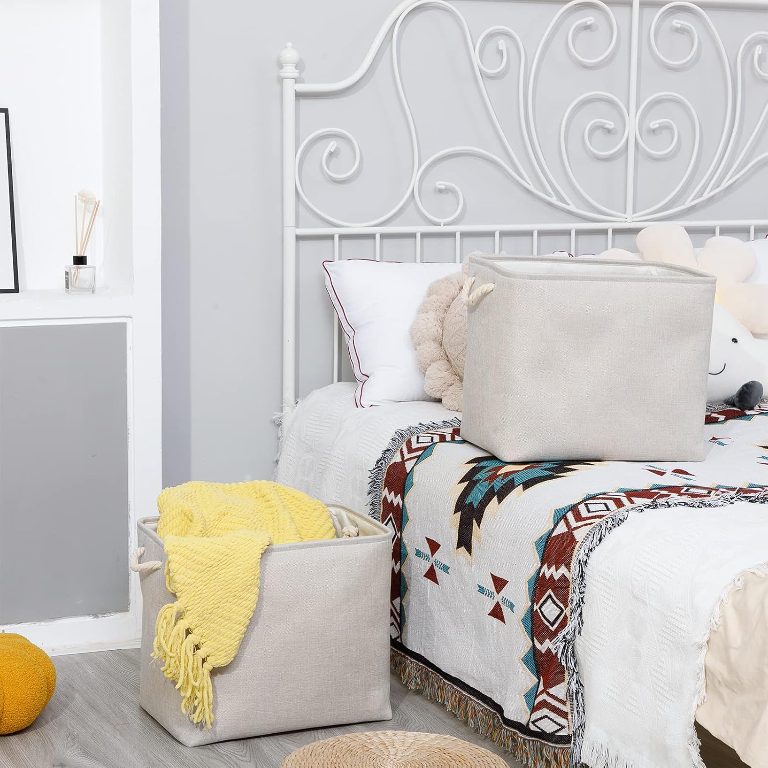 • [Multipurpose Storage] These large linen storage baskets for organizing provide an efficient solution in your home, office or travel to meet many storage needs such as organizing clothes, towels, blankets, toys, baby products, pet products, magazines, newspapers, camping tools, etc. Its storage capacity can keep the family tidy and beautiful, shelf baskets for organizing closet are a wonderful choice