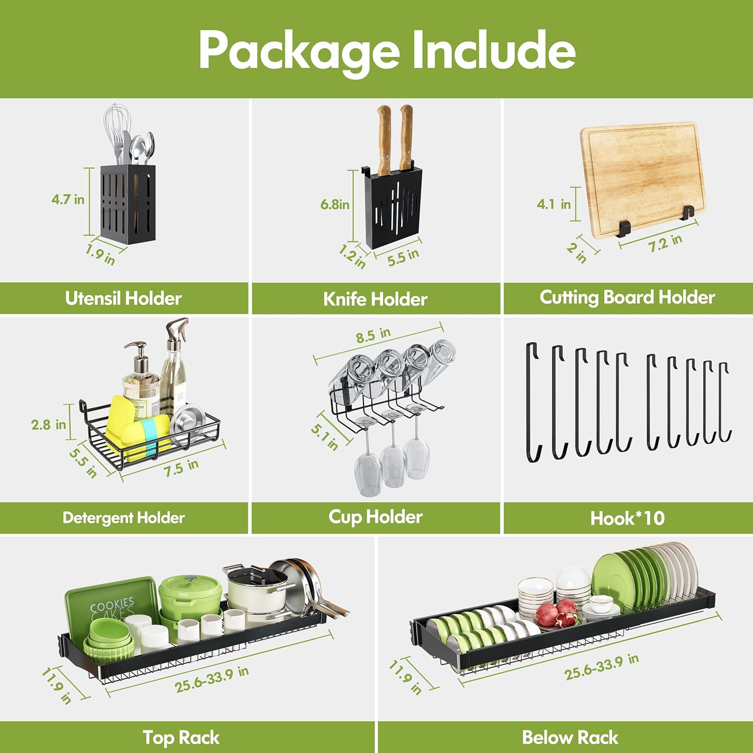• 🧺 Multi Level Storage Efficiency: Three spacious tiers organize dishes by type, large cookwares on top, bowls and plates in the middle, while dedicated sponge holder and hanging hooks keep sponges and brushes accessible. The dish rack over sink open grid design accelerates drying by promoting airflow, reducing water spots
