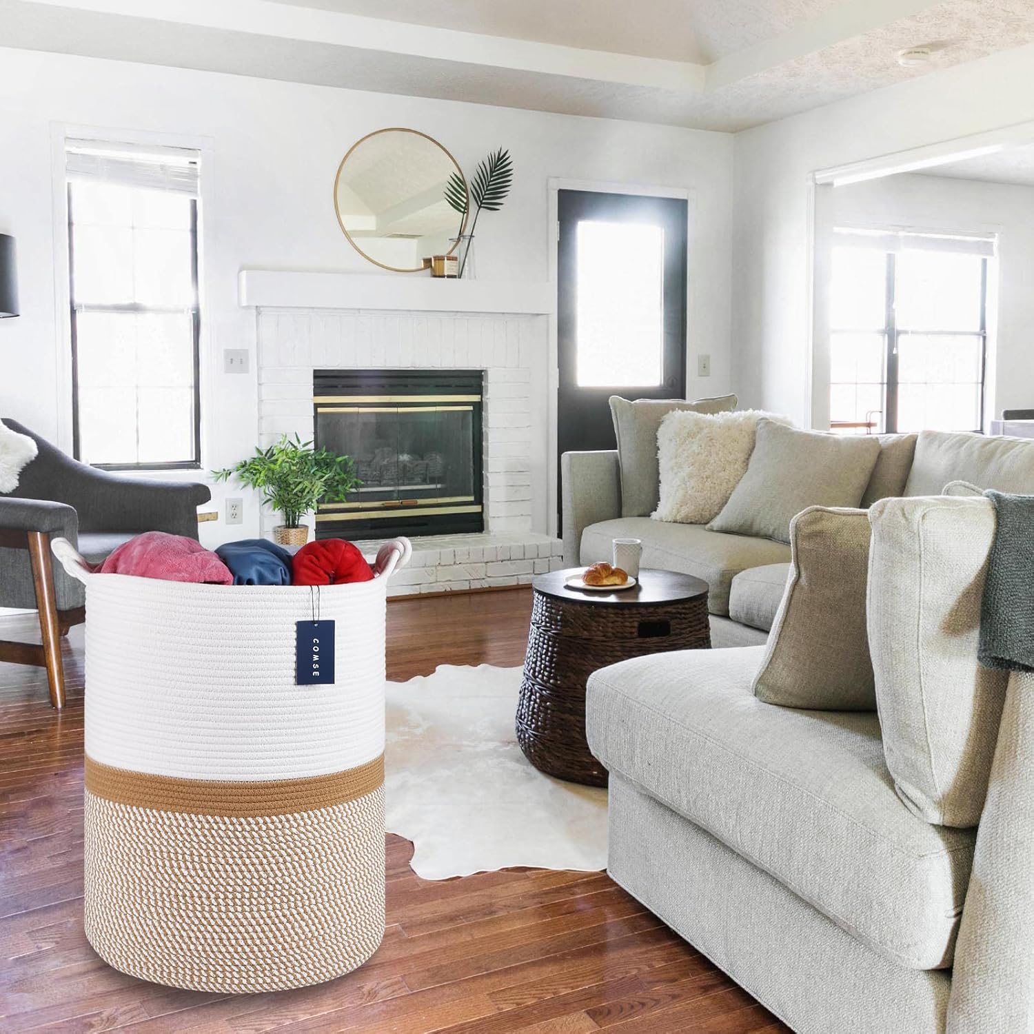 COMSE Extra Large Blanket Basket, Tall Woven Storage Basket, Nursery Hamper, 15.7”x 21.7”, Cotton Rope Laundry Hamper for Toys Clothes Towels, Blend White/Camel