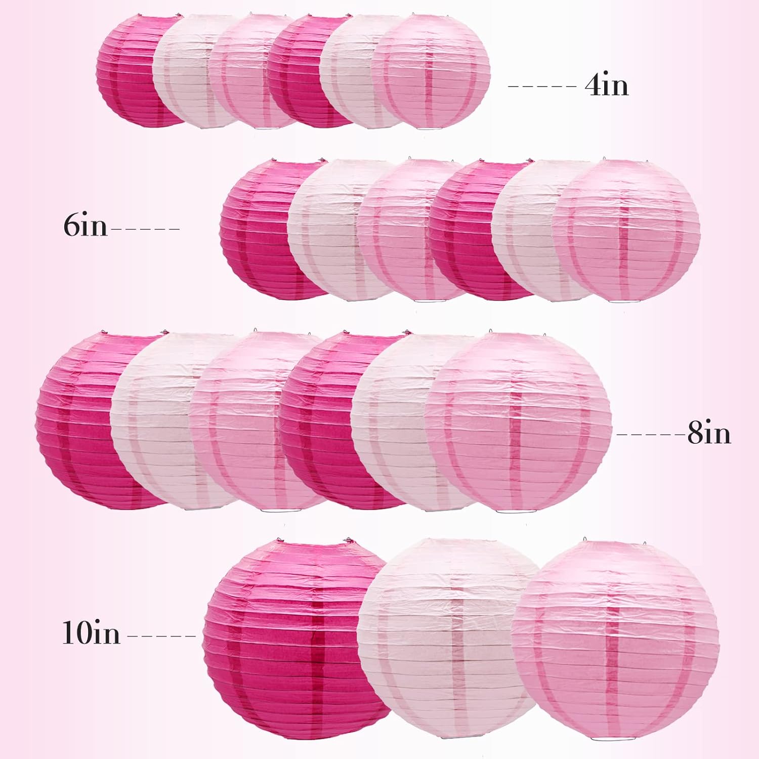 • PAPER LANTERNS SETS CONTENT - 3 Assorted baby pink, pink, hot pnk paper lantern value combination pack of 21 pieces assorted size ranging from Small to X-Large. You will receive 6 pcs of 4 Inch Lanterns, 6 pcs of 6 Inch Lanterns, 6 pcs of 8 Inch Lanterns, 3 pcs of 10 Inch Lanterns. These Chinese lanterns can be matched with many scenes and themed party decorations to create a distinctive party decoration and make the party more unique